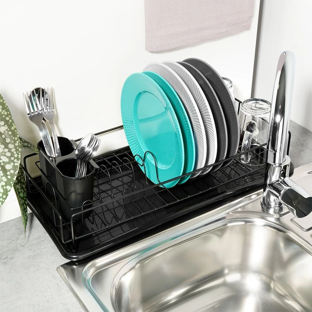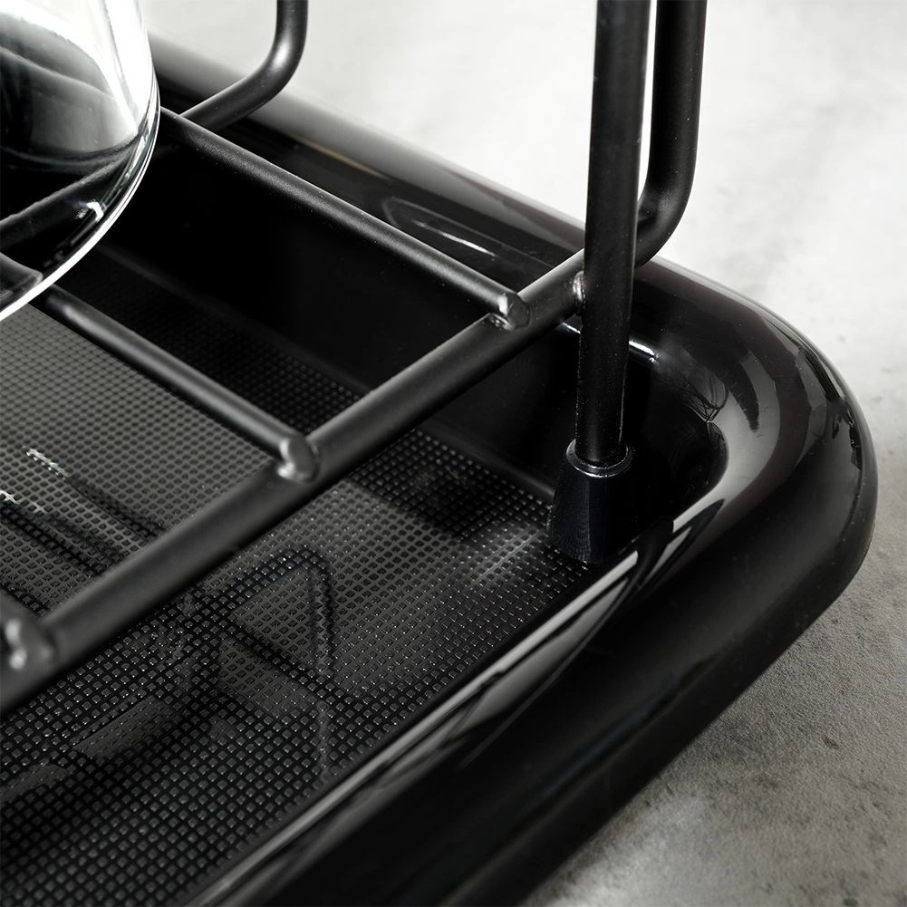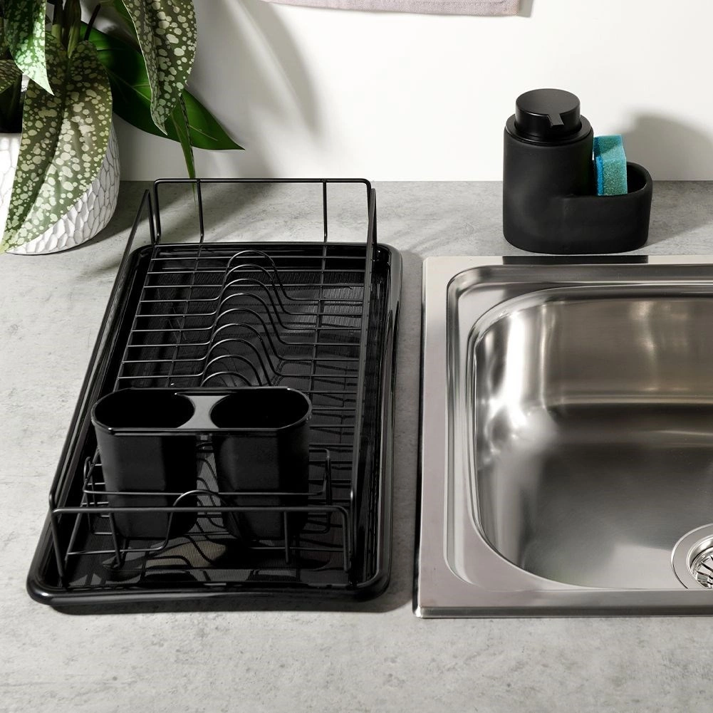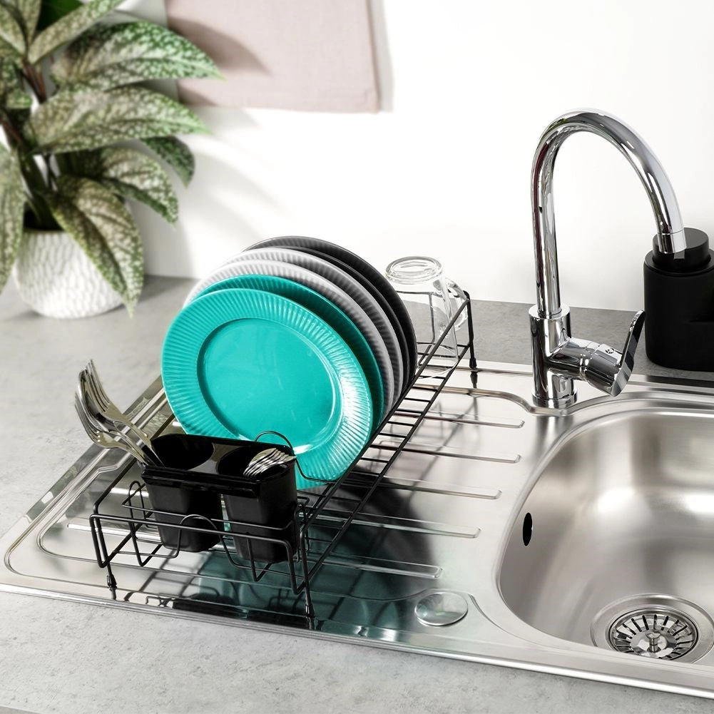 Eleganten in kompakten odcejalnik za posodo v črni barvi je praktičen dodatek vsake kuhinje. Zahvaljujoč trdnemu kovinskemu okviru in odstranljivi plastični odcejalni posodi bo vaša delovna površina ostala čista in suha. Premišljena razporeditev z držali za krožnike ter prostorom za skodelice zagotavlja hitro in higiensko sušenje.