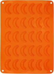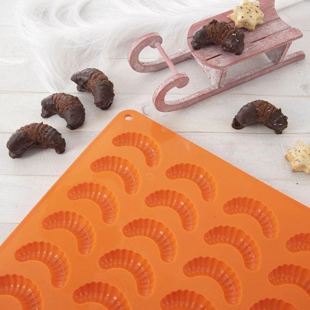 Ta oranžen silikonski model Sillinie je idealen za enostavno pripravo piškotov, čokoladic in pralin v obliki rogljičkov. Zahvaljujoč nelepljivi površini se testo ne prijema in pečene kose zlahka odstranite brez namastitve ali posipanja z moko.