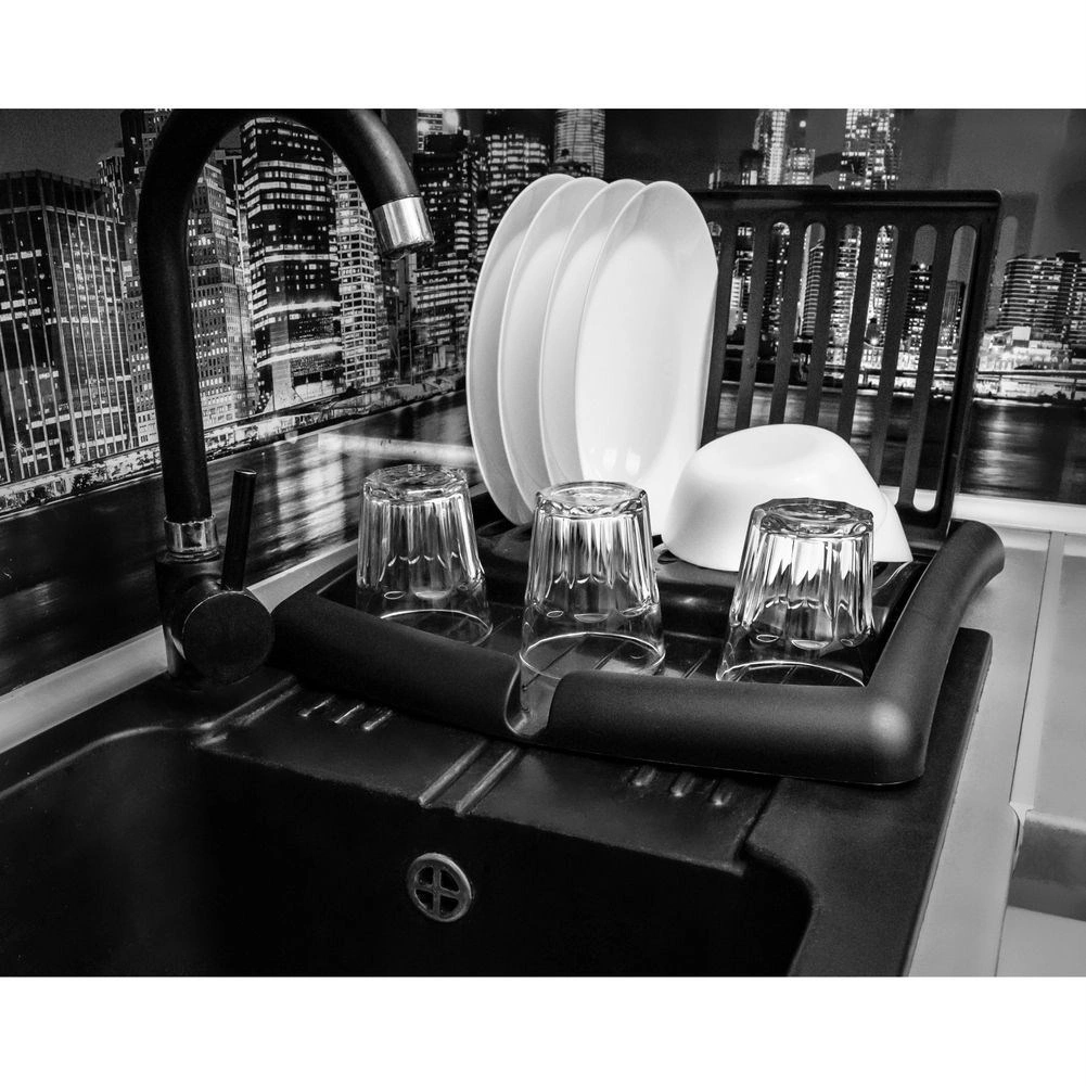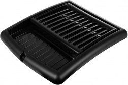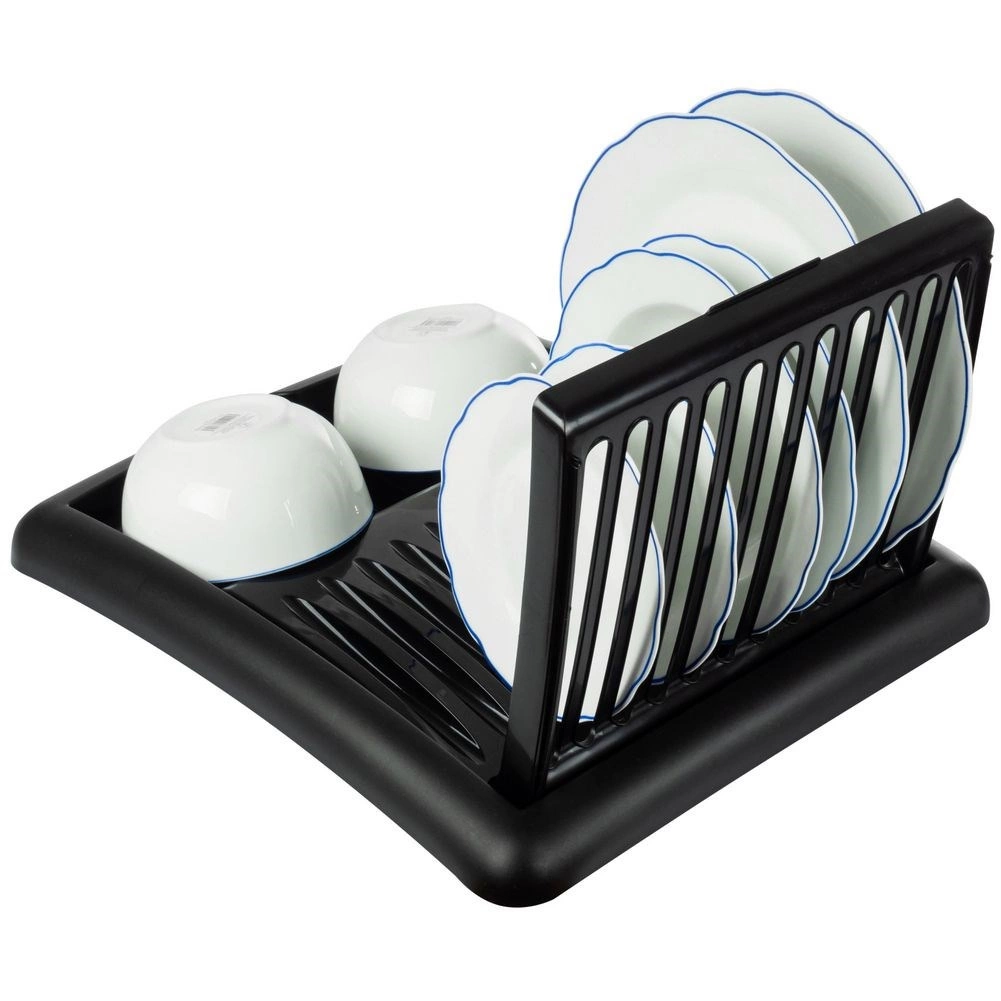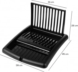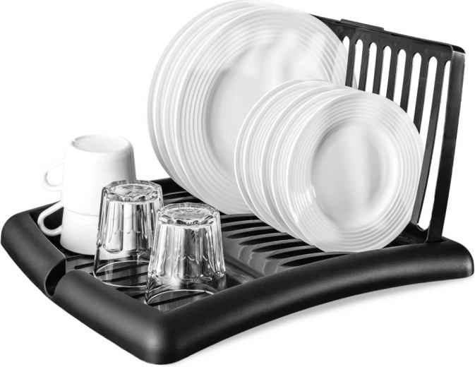 Moderna črna izvedba se poda v moderne in klasične interierje. Konstrukcija iz kakovostne plastike je lahka, čvrsta in brez tveganja korozije. Ko je zloženo, stojalo zavzame minimum prostora – idealno za manjše kuhinje in gospodinjstva z omejenim prostorom.