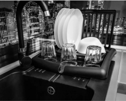 Praktično odcejalno stojalo za posodo je nepogrešljiv pomočnik v vsaki kuhinji. Zahvaljujoč pametni razporeditvi ponuja namenski prostor za 11 krožnikov, prostor za skodelice in kozarce ter integriran odtok, ki varno odvaja vodo v korito in tako ščiti kuhinjski pult pred vlago.