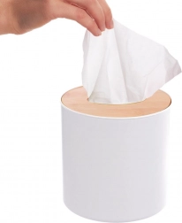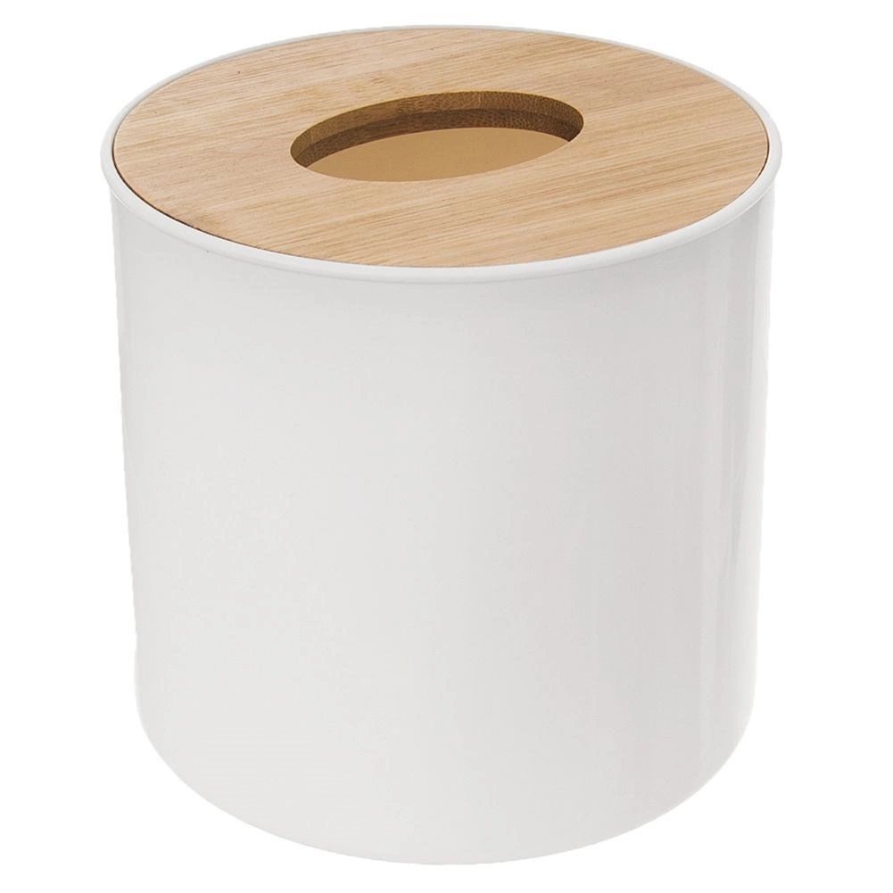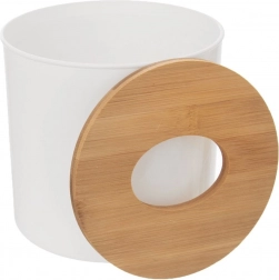 Ta majhen, a praktičen koš je odličen za vsakodnevne drobne odpadke. Združuje belo plastično ohišje z bambusovim pokrovom s sredinsko odprtino za hitro in higiensko odlaganje. Zaradi kompaktnih mer se prilega na polico, okensko polico ali delovno površino.