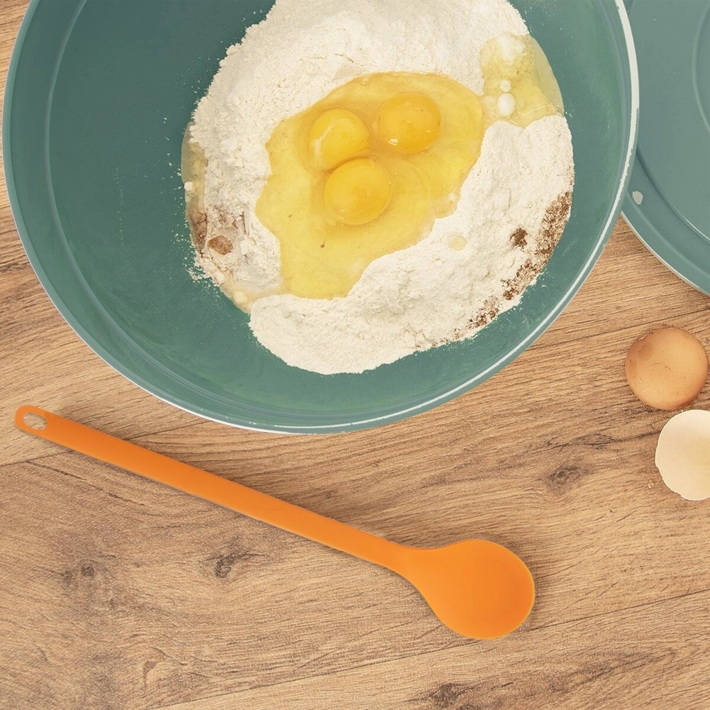 Zahvaljujoč kovinski ojačitvi v notranjosti žlica ohranja obliko in zlahka obvlada gostejša testa ali težje zmesi. Nedrseč ročaj odlično sede v roko, zanka na koncu pa omogoča obešanje na letvico. Material ne absorbira vonjav niti tekočin in ga je mogoče pomivati v pomivalnem stroju, zato je vzdrževanje hitro in higiensko.