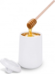 Posoda je iz trpežnega belega porcelana, žlička pa iz naravnega lesa za udobno in nežno zajemanje medu.
