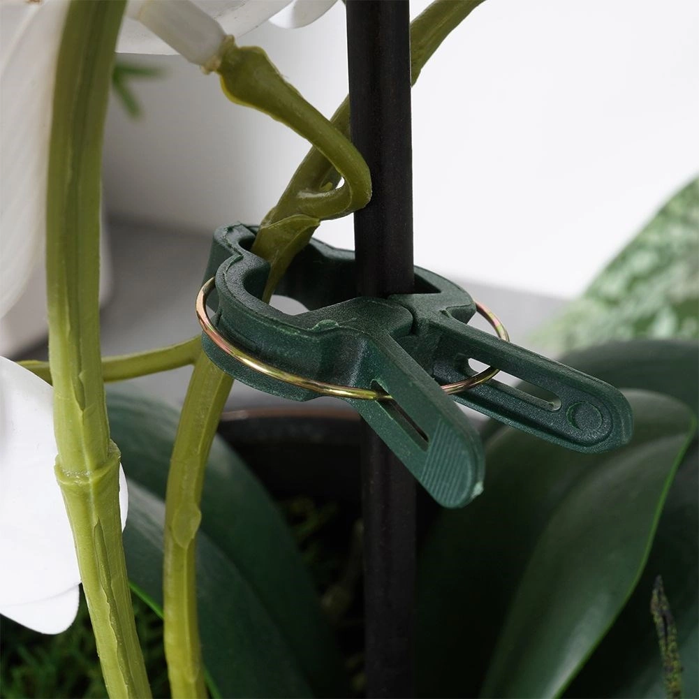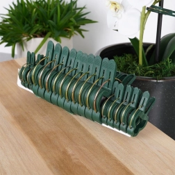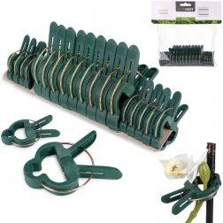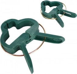 Vzmetni mehanizem z rebrastimi čeljustmi drži trdno, vendar brez poškodb rastlin. Idealno za pritrjevanje na količke in opore.