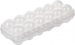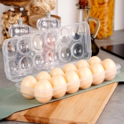 Posebno oblikovana mesta trdno držijo vsako jajce na svojem mestu, medtem ko trden pokrov s sponko preprečuje neželeno odpiranje med uporabo. Škatla je lahka, večkrat uporabna in odlična za nakupe na tržnici, za hladilnik in zamrzovalnik.