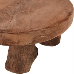 Ta okrogla servirna deska je ročno izdelana iz kakovostne tikovine in stoji na trdnih nogicah za maksimalno stabilnost ter privlačno predstavitev. Naravna struktura lesa in rustikalen videz vsakemu pogrinjku dodata avtentičen šarm, ne glede na to, ali servirate tapase, pecivo, sire ali mesnine.