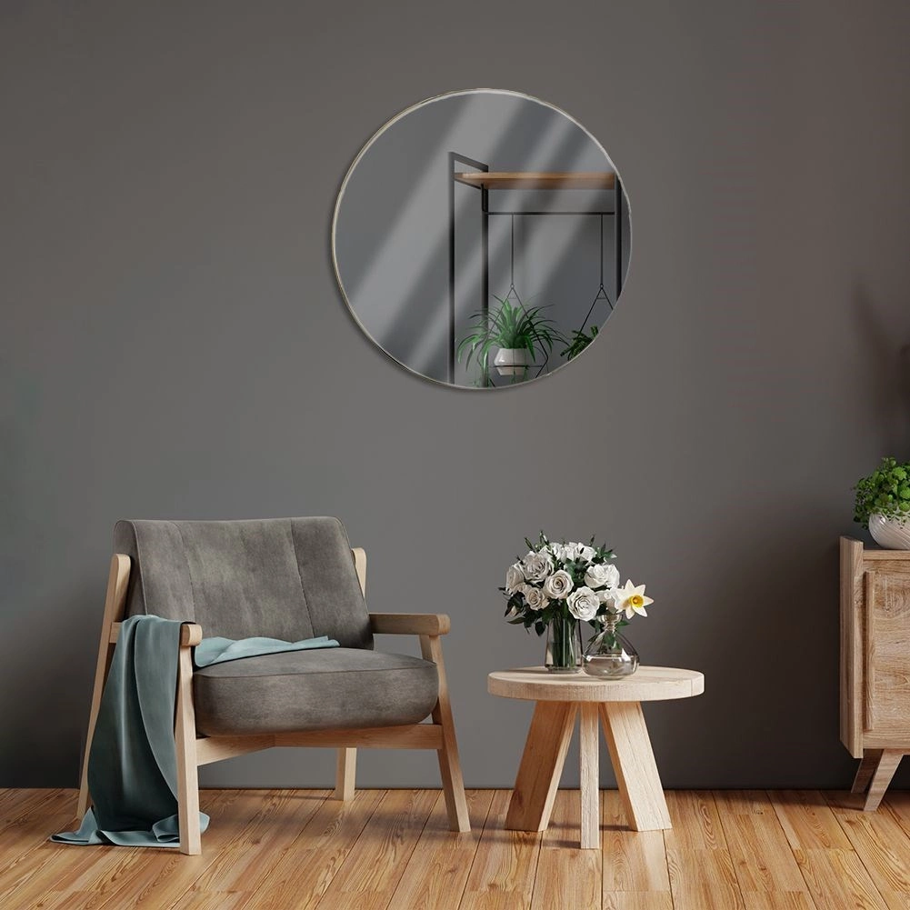 Elegantno stensko ogledalo v modnem zlatem videzu je univerzalna dekoracija za vsak interier. Zaradi premera 55 cm in tankega okvirja deluje zračno, poudari slog prostora in hkrati predstavlja praktičnega pomočnika za vsakodnevno uporabo.