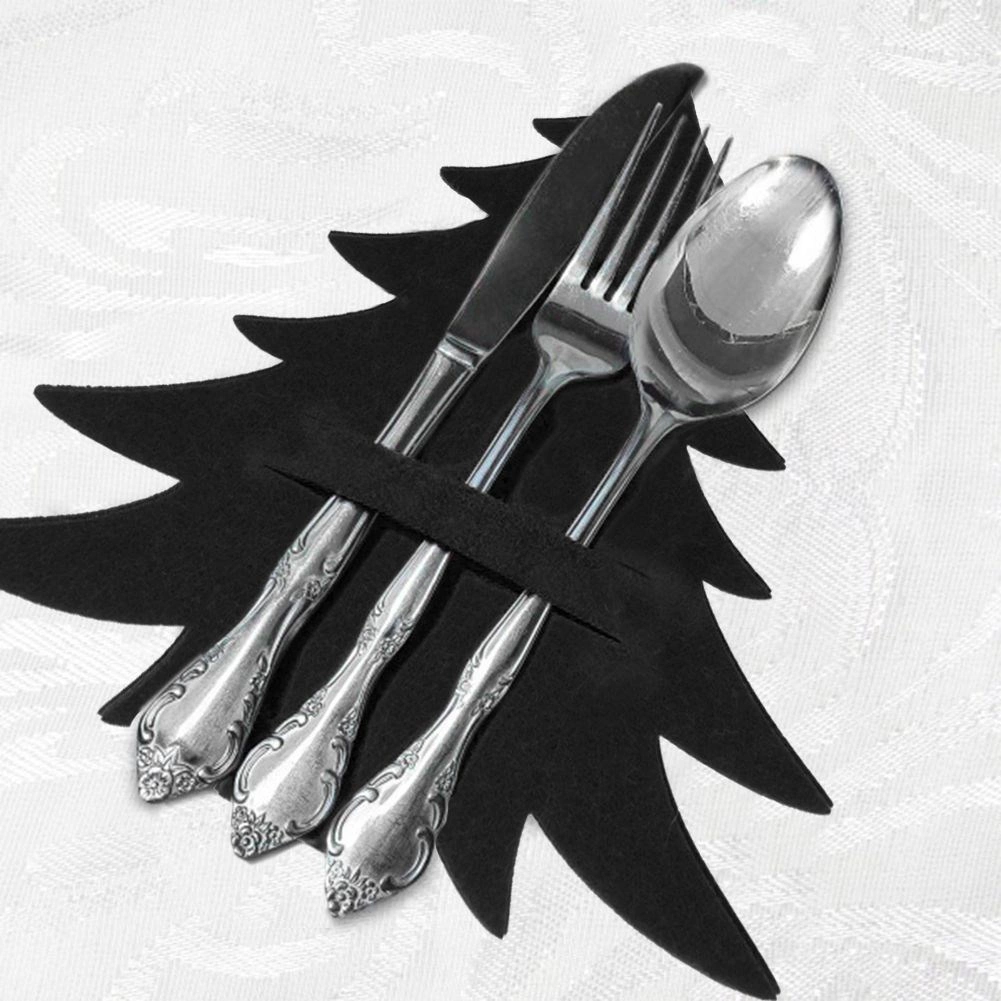 Ustvarite doma edinstveno božično vzdušje z etuiji za pribor v obliki smrekice. Črn filc doda pogrinjku sodoben, kontrasten videz in se ujema s katerokoli praznično okrasitvijo ter namiznim posodjem. Praktični reži zanesljivo držita celoten set pribora in ga elegantno predstavita.