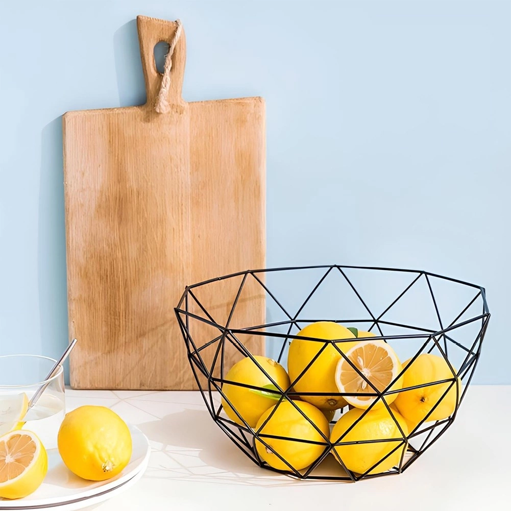 Ta elegantna črna košara je idealna za razstavljanje in shranjevanje sadja ter zelenjave na kuhinjskem pultu ali jedilni mizi. Odstranljiv kavelj omogoča obešanje banan ali grozdja, s čimer preprečuje odtise in podpira enakomerno dozorevanje. Minimalistična geometrijska konstrukcija deluje dekorativno in hkrati ohranja vsebino pregledno.