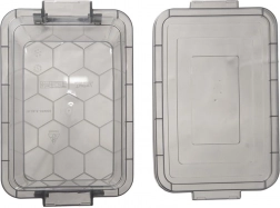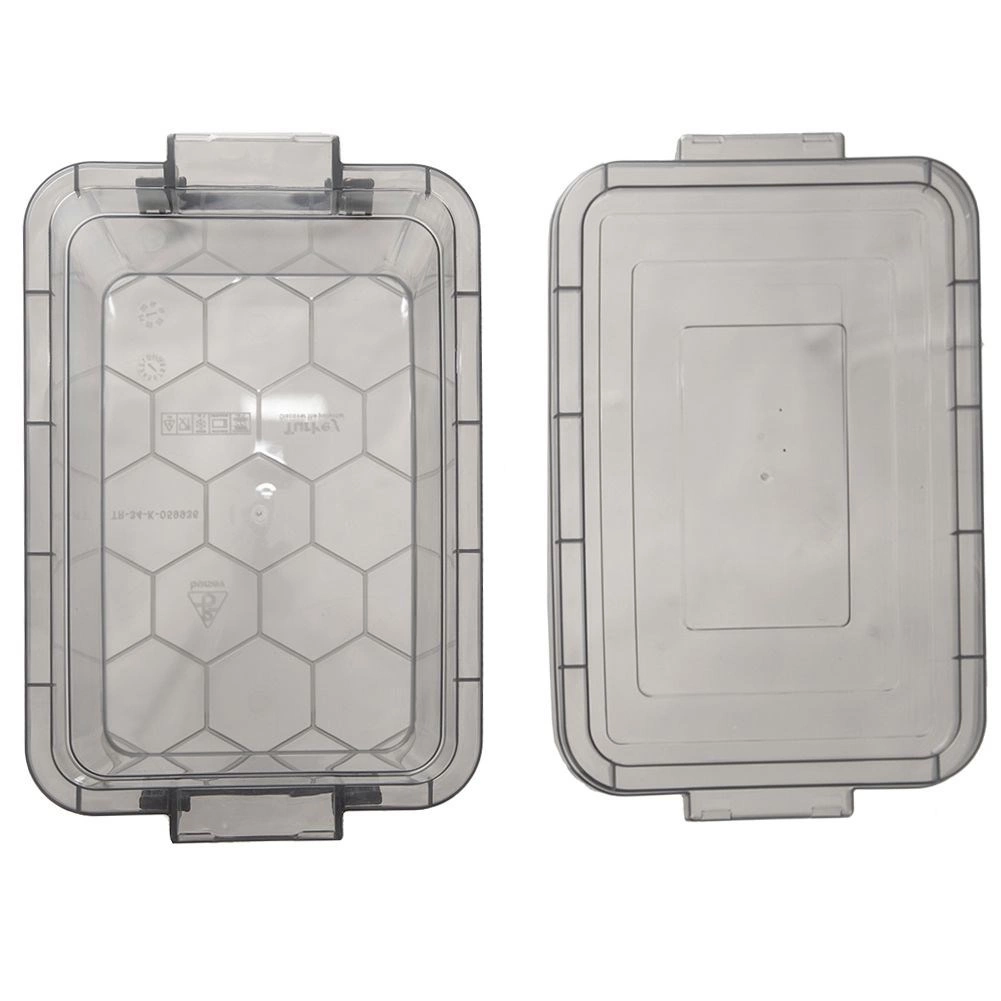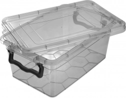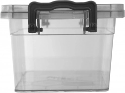 Praktična shranjevalna škatla iz kakovostne, za zdravje neškodljive plastike v temno sivi, prosojni izvedbi omogoča takojšen pregled nad vsebino brez odpiranja. Zahvaljujoč trdnemu pokrovu z dvema stranskima sponkama ostane vse varno zaprto in zaščiteno pred vlago ter nečistočami.