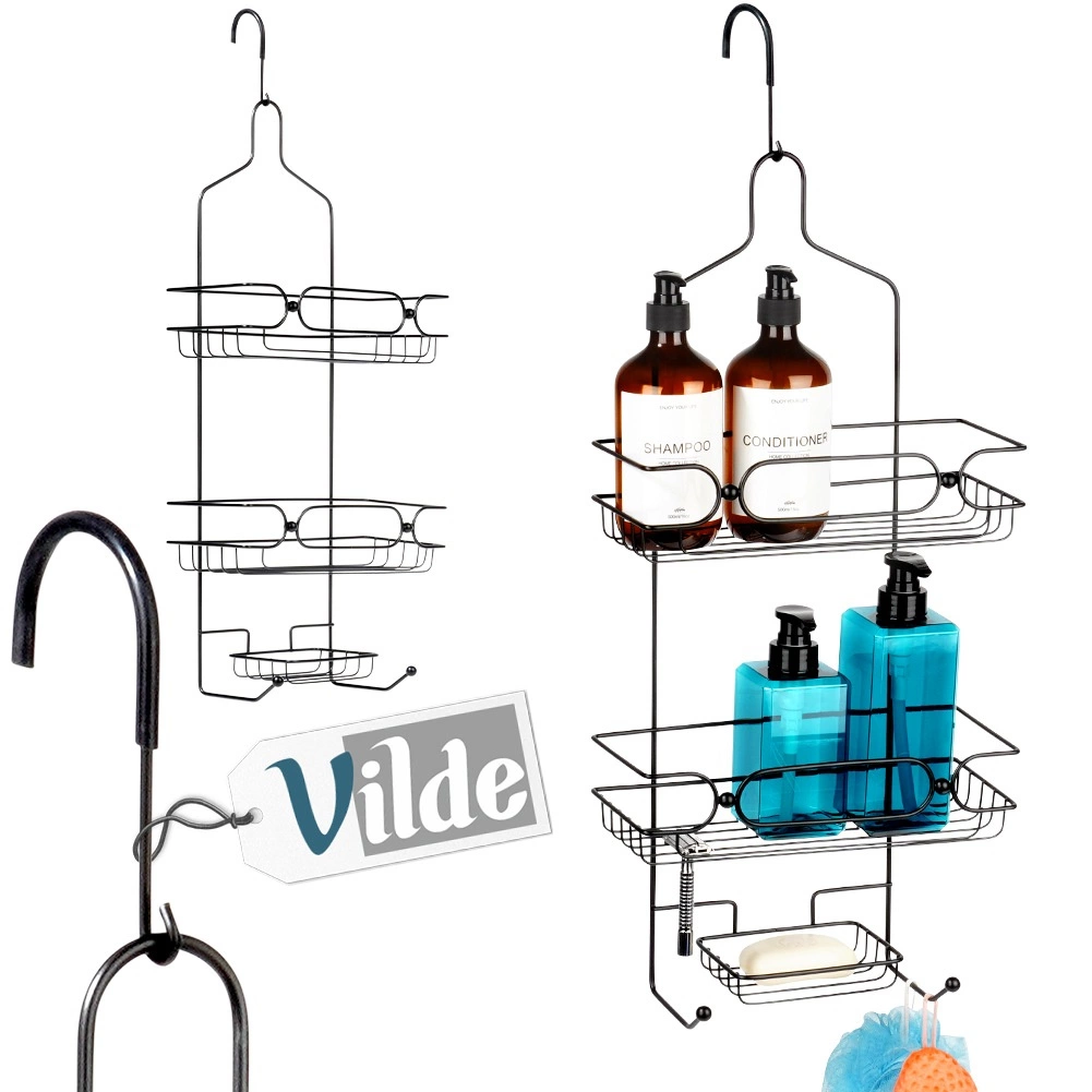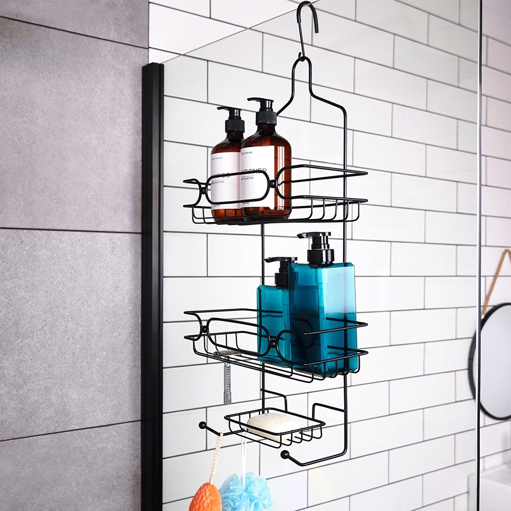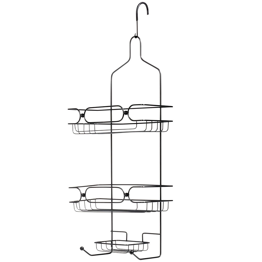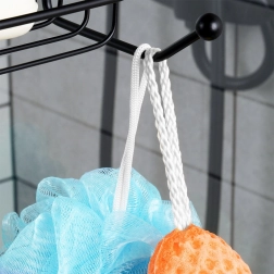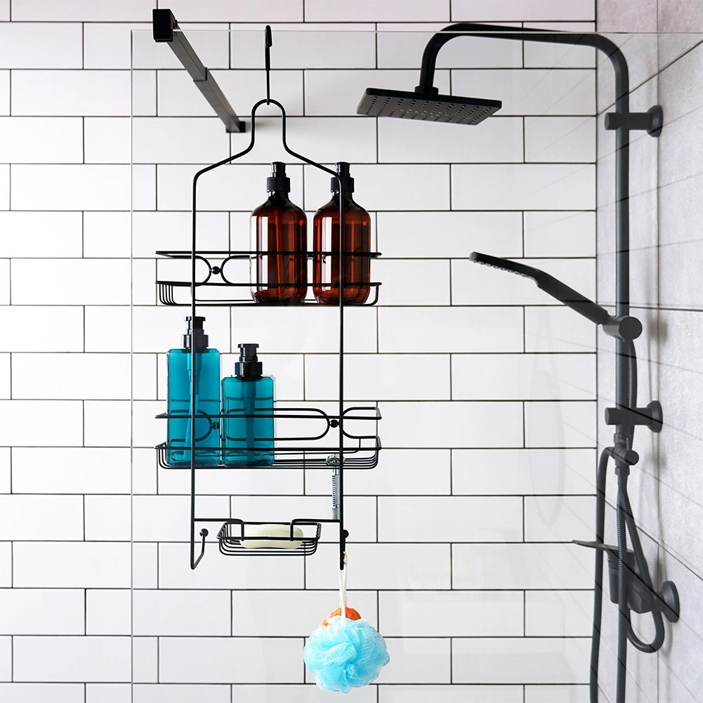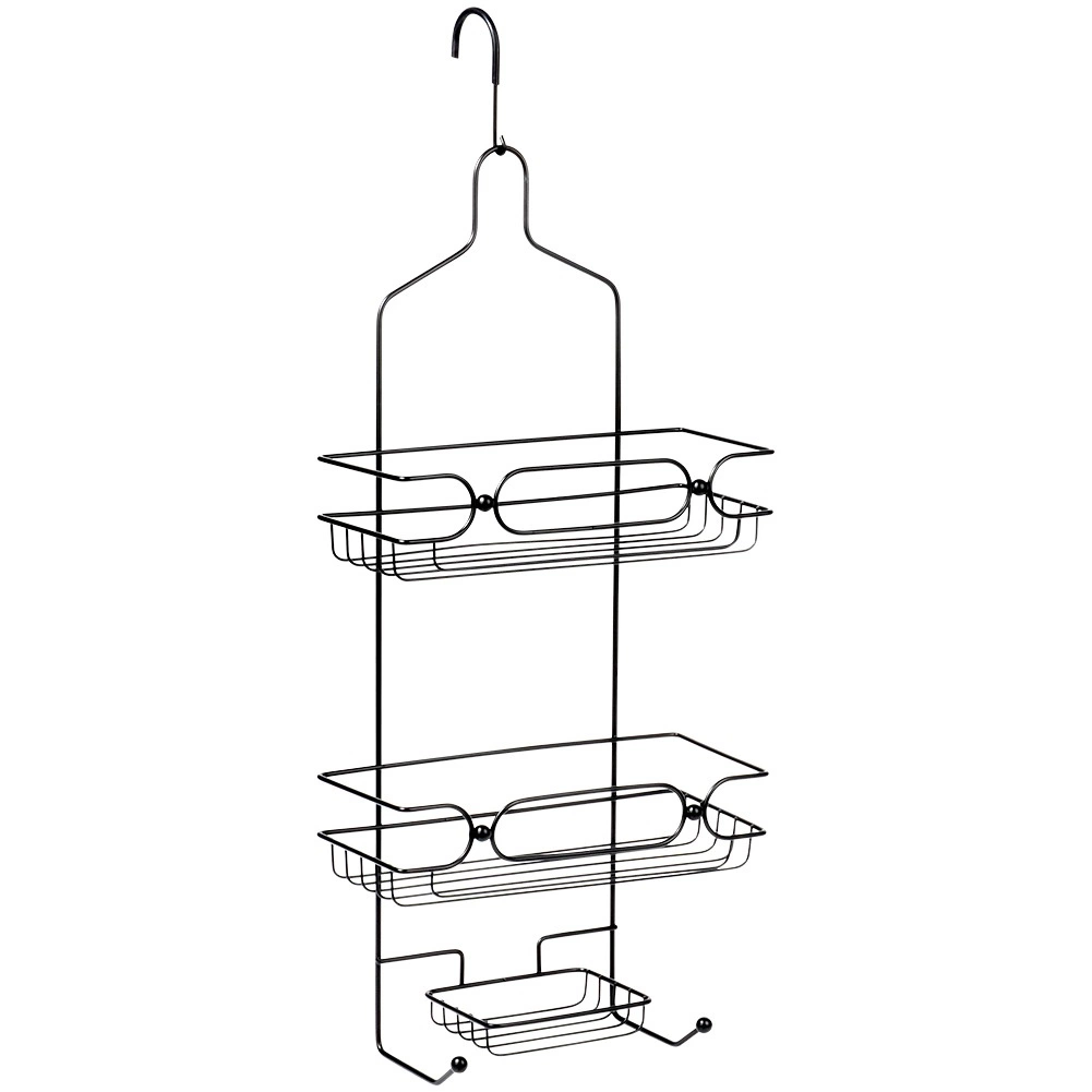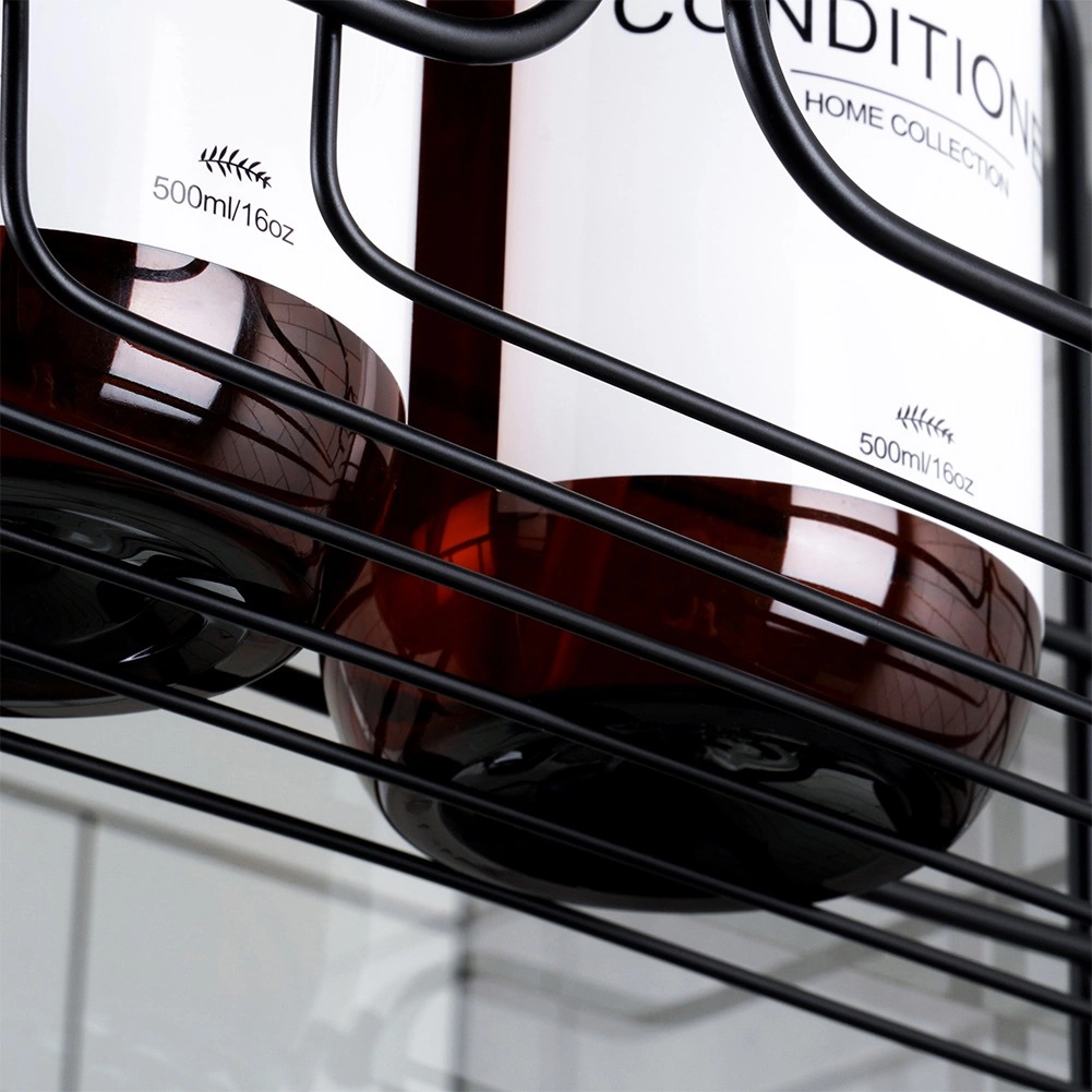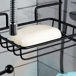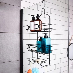 Kakovostna kovina s črnim premazom je močna in odporna proti koroziji, zato polica zanesljivo prenese vsakodnevno uporabo. Gumijasti sloj na obešalnem kavlju ščiti steklo in preprečuje drsenje. Dve veliki polici zlahka sprejmeta šampone in gele, spodnji milohran in dvojne kljukice pa so idealni za gobice, britvice ali krtače.