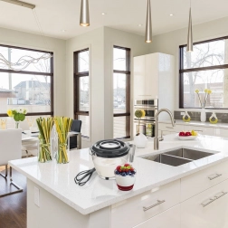 Odstranljiv sredinski del pokrova omogoča vstavitev metlic ročnega mešalnika in hkrati preprečuje škropljenje sestavin po kuhinji.