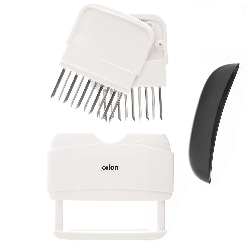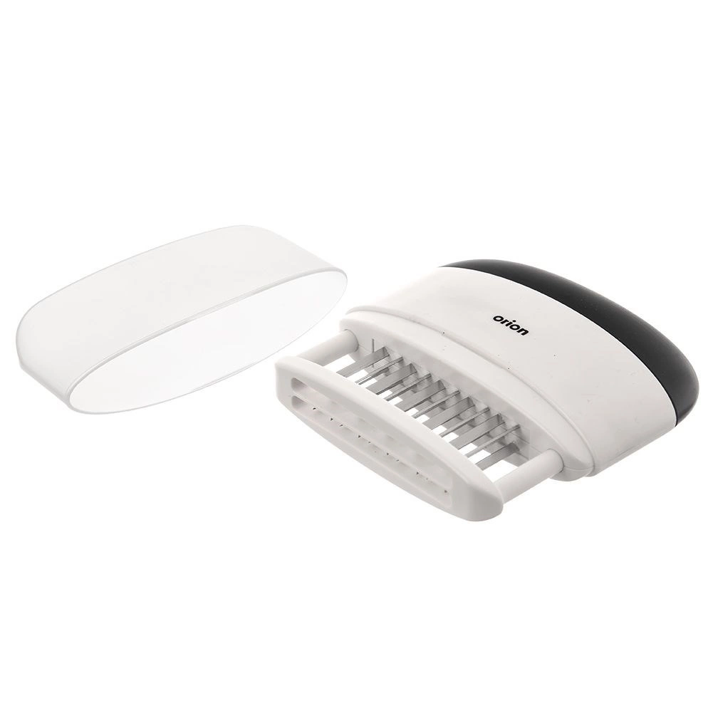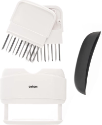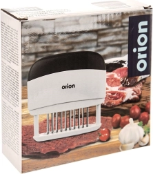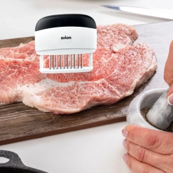 Kompaktno kuhinjsko orodje ima ergonomski ročaj za udoben oprijem in odstranljiv zaščitni pokrov za varno shranjevanje. Ohišje je iz kakovostne plastike, igle iz nerjavnega jekla, primernega za stik z živili. Dovolj je, da ga prislonite k mesu in pritisnete – hitro, čisto in učinkovito.
