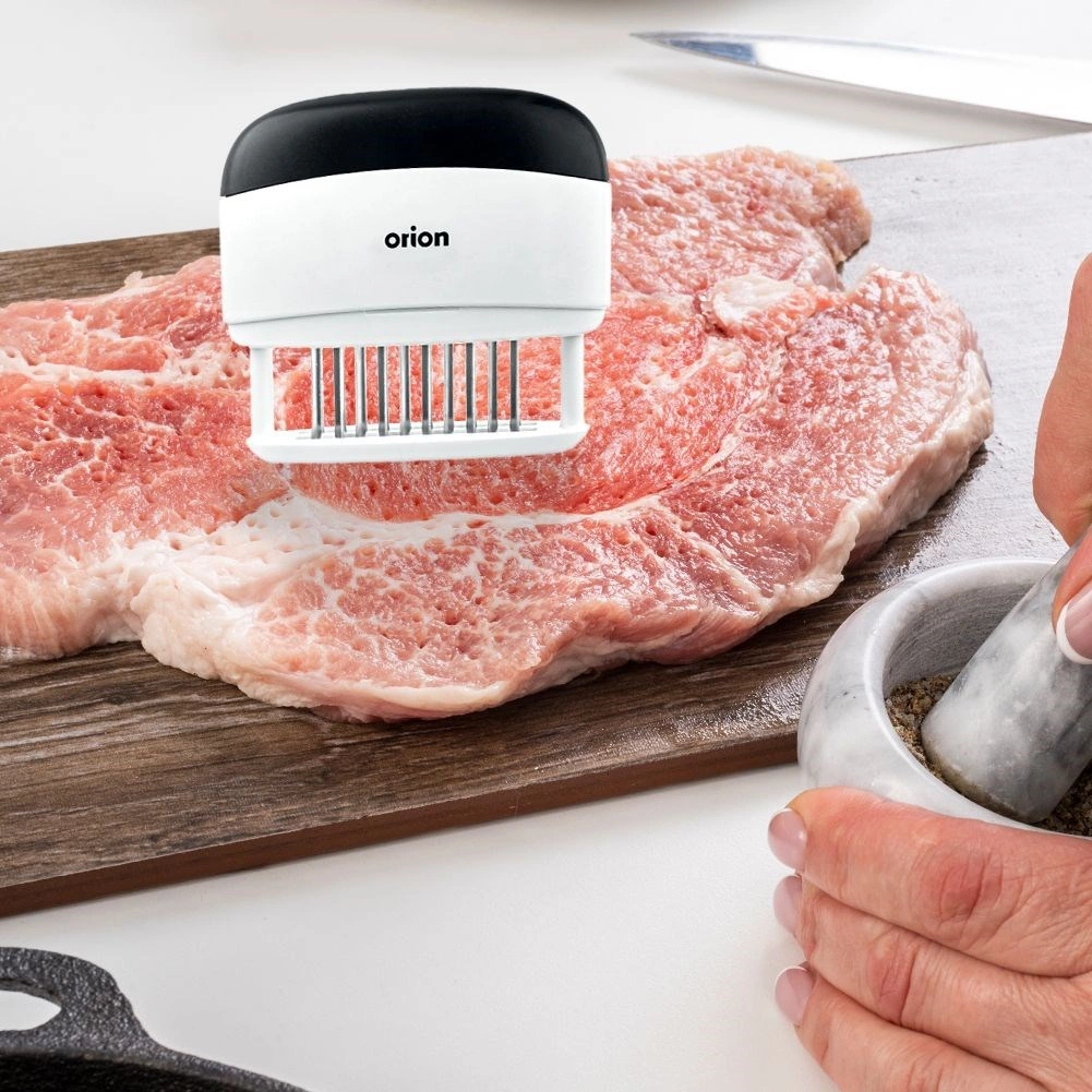 Gosto polje ostrih nerjavnih igel prodira globoko v meso, mehča vlakna in zagotavlja hitrejšo ter enakomernejšo pripravo.