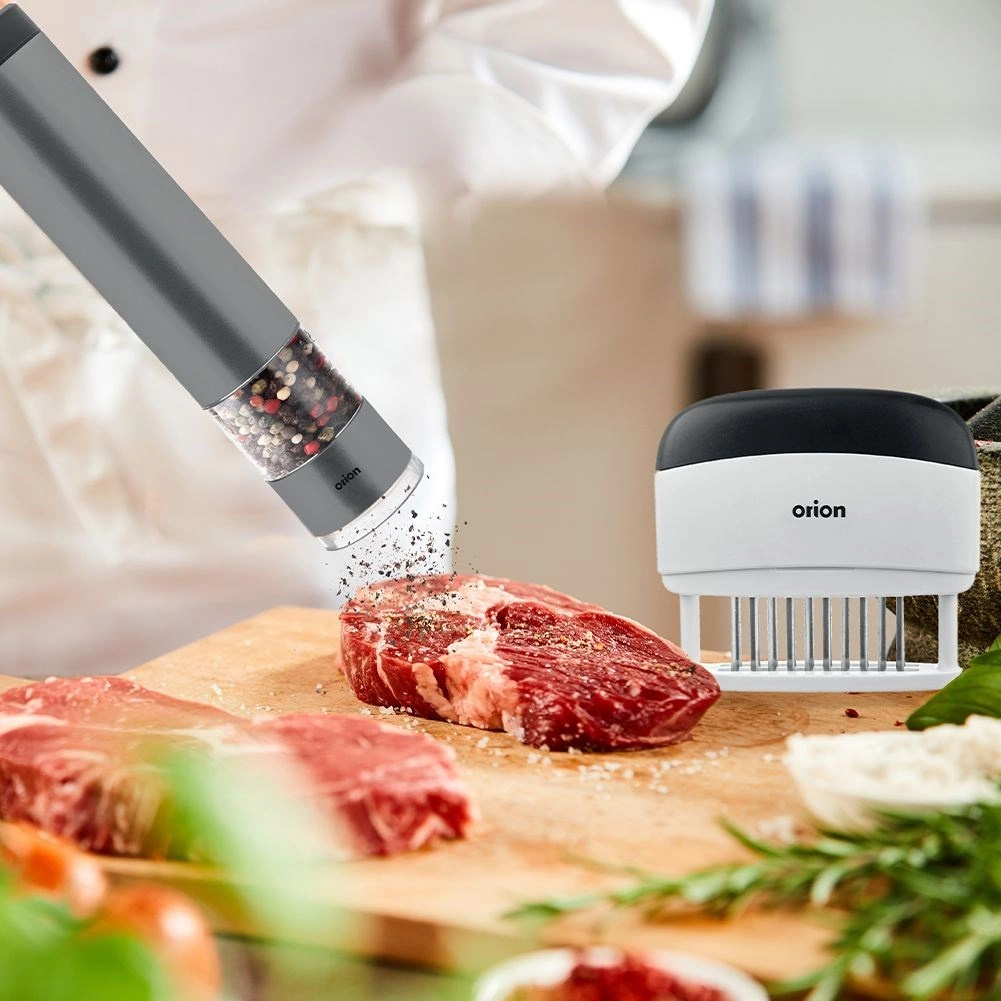 Poenostavite pripravo sočnih steakov, zrezkov in pečenk. Ta injektor za meso z 20 nerjavnimi iglami prebada mišična vlakna v globino, s čimer skrajša čas toplotne obdelave, zmehča strukturo in omogoči, da marinada enakomerno prodre v notranjost. Rezultat sta polnejši okus in večja sočnost.