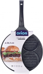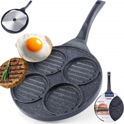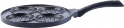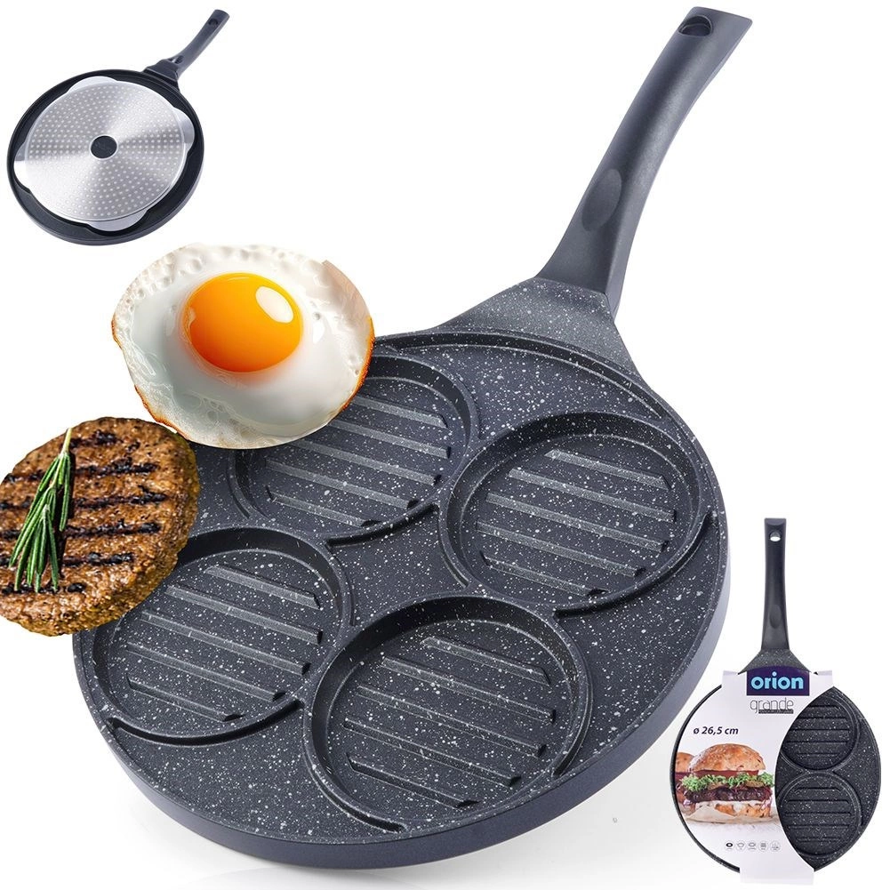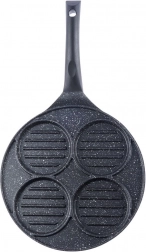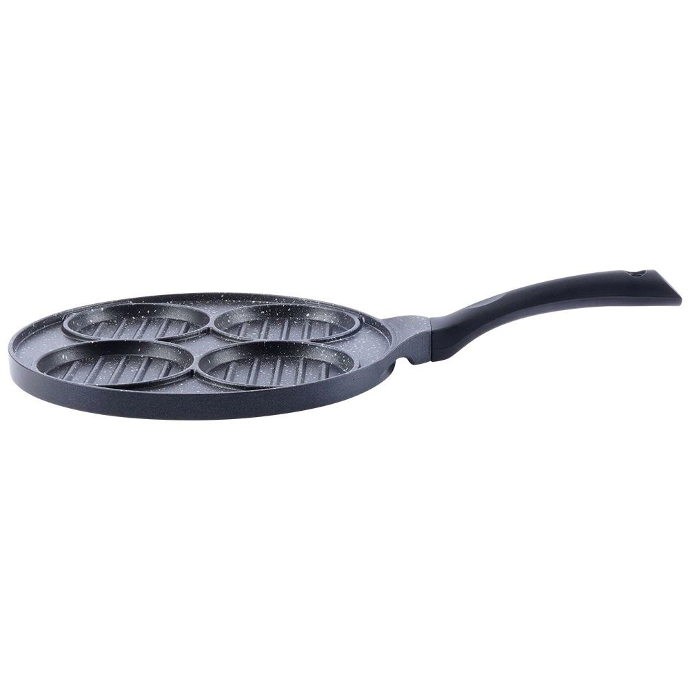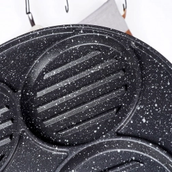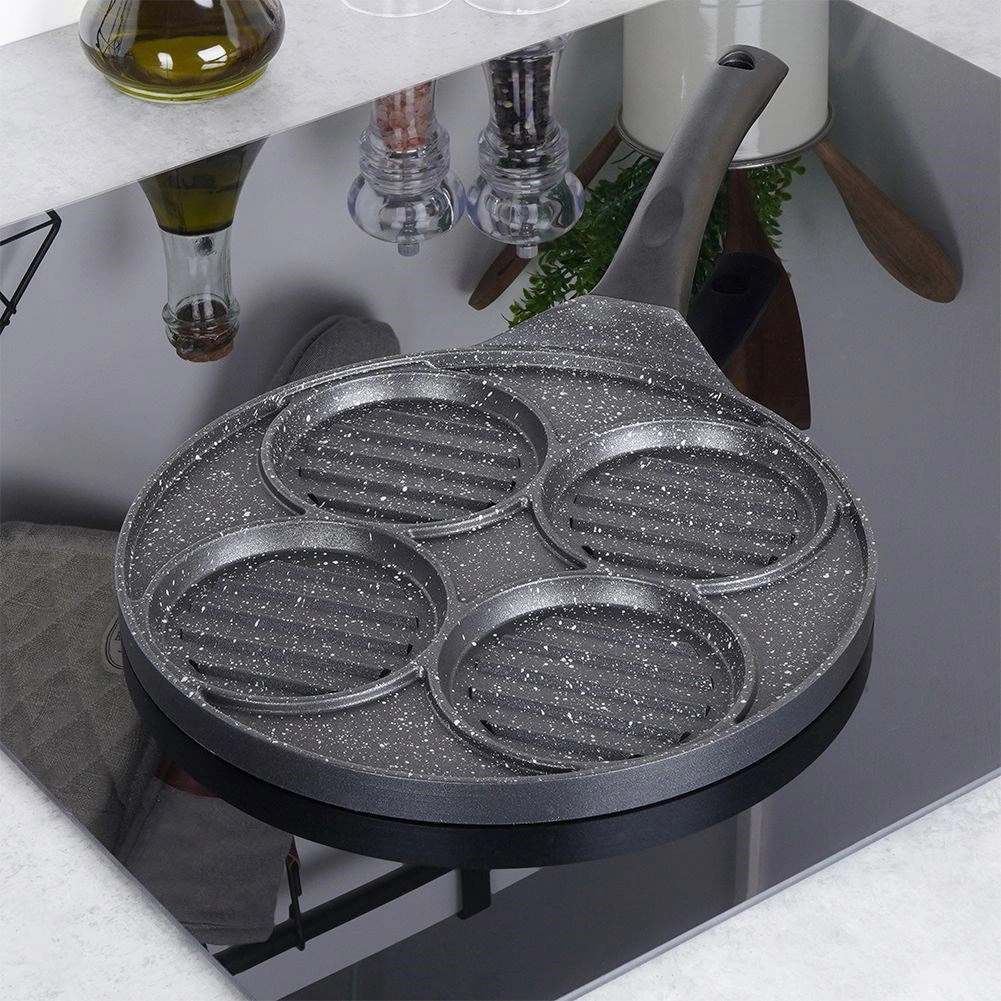 Ta večnamenska ponev s premerom 26,5 cm in štirimi ločenimi krožnimi sekcijami (vsaka pribl. 10 cm) vam omogoča, da hkrati pripravite burgerje, jajca na oko, palačinke ali zelenjavne polpetke brez mešanja okusov. Granitni nelepljivi premaz PFLUON GRANIT zagotavlja minimalno prismoditev, manjšo porabo olja in enostavno čiščenje.