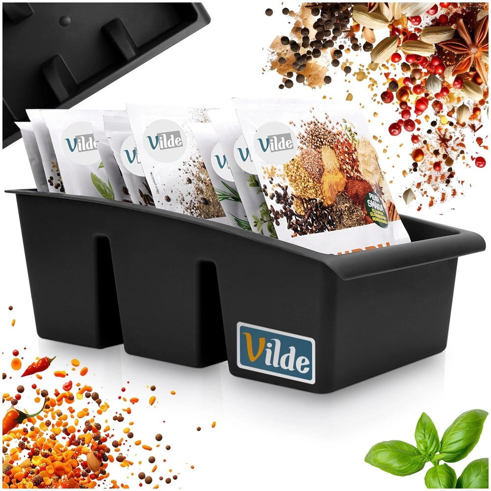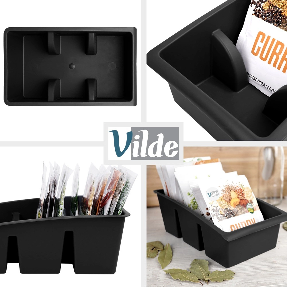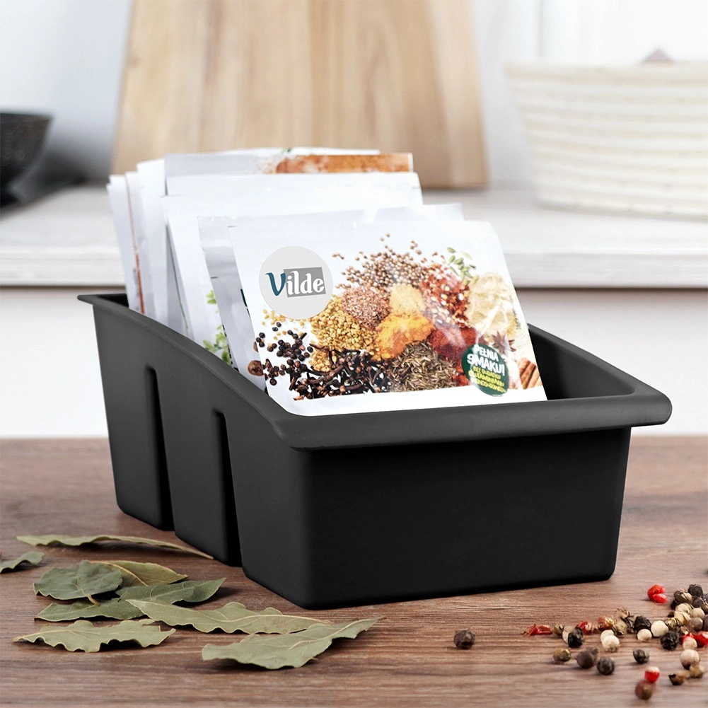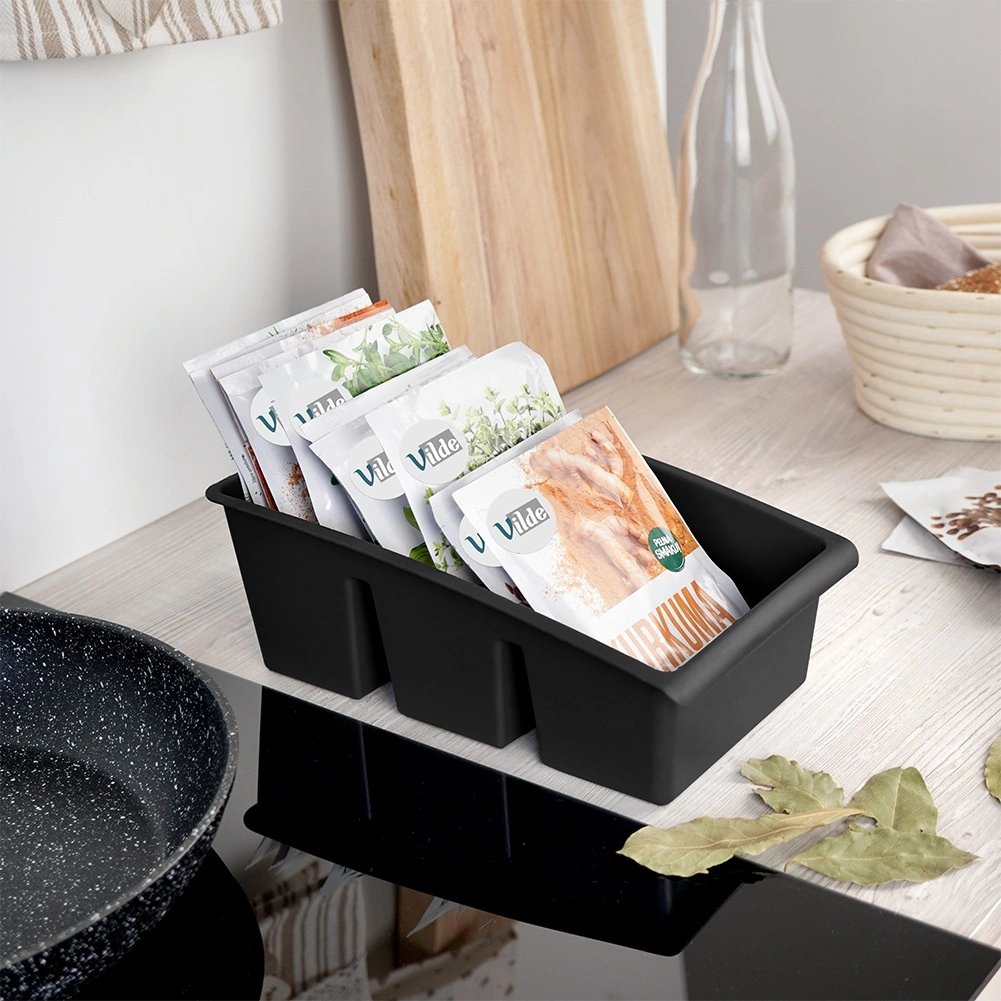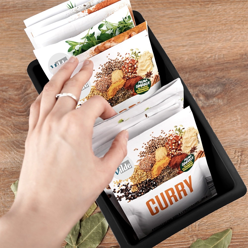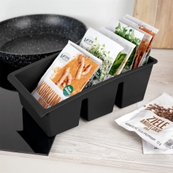 Ta praktičen kuhinjski organizator je zasnovan za pregledno shranjevanje vrečk z začimbami in zelišči. Tri ločene sekcije držijo vrečke stabilno v pokončnem položaju, zato boste vedno hitro našli tisto, kar potrebujete. Črna izvedba se poda vsaki moderni kuhinji, vzdržljiv material pa je preprost za čiščenje.