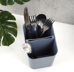 Mere 14 × 11 × 16 cm zagotavljajo kompaktno velikost za kuhinjski pult ali ob koritu. Odkapnik je primeren ne le za sušenje opranega pribora, temveč tudi kot organizator za kuhinjske pripomočke – žlice, vilice, noži ali ščetke za steklenice bodo vedno pri roki. Vzdrževanje je izjemno enostavno, celoten nosilec lahko pomivate v pomivalnem stroju.