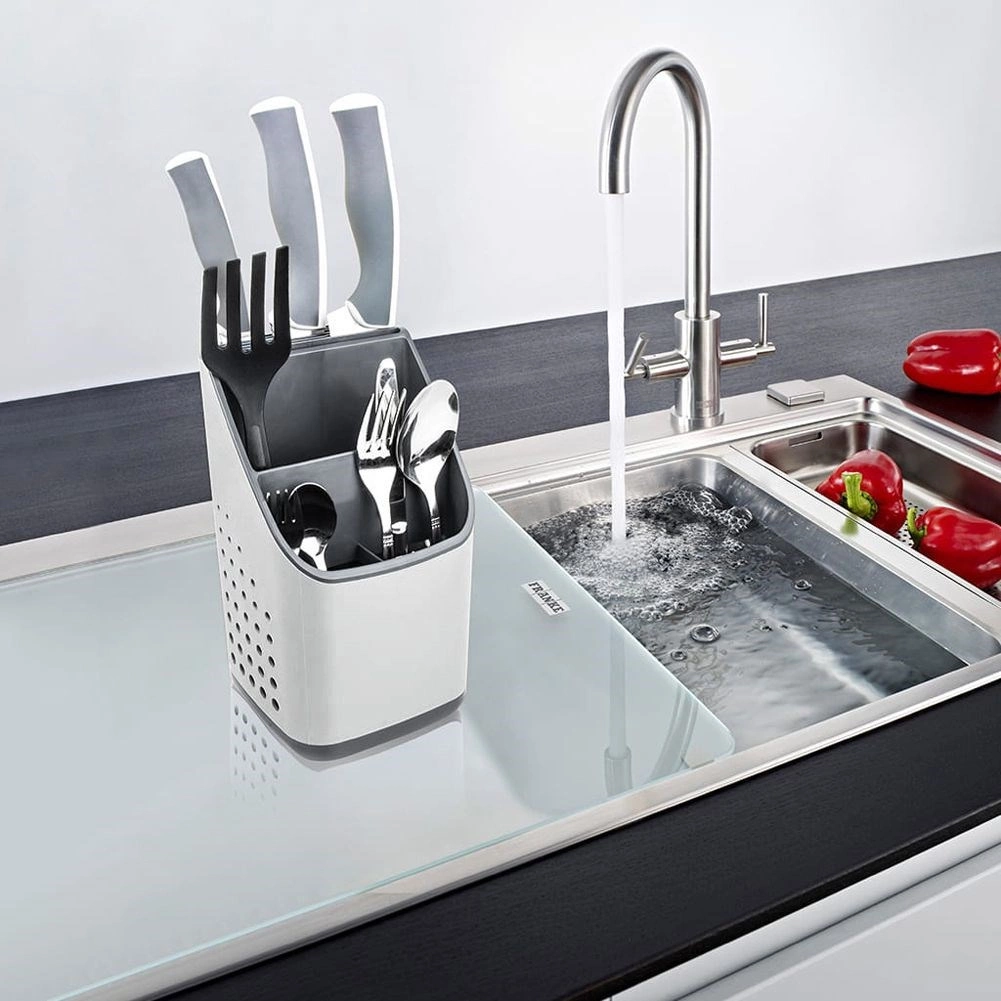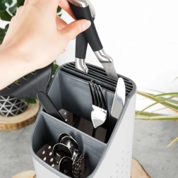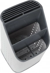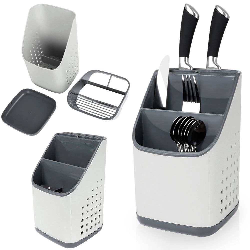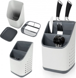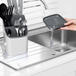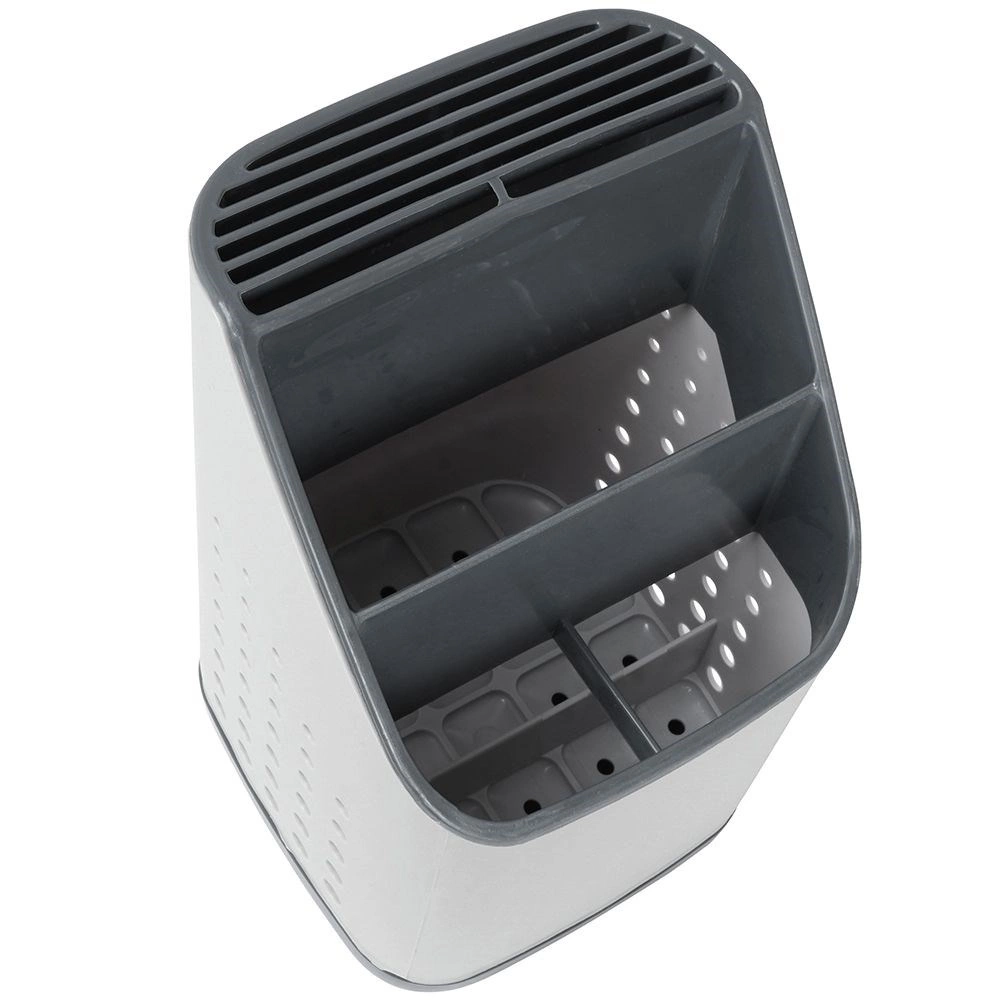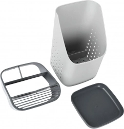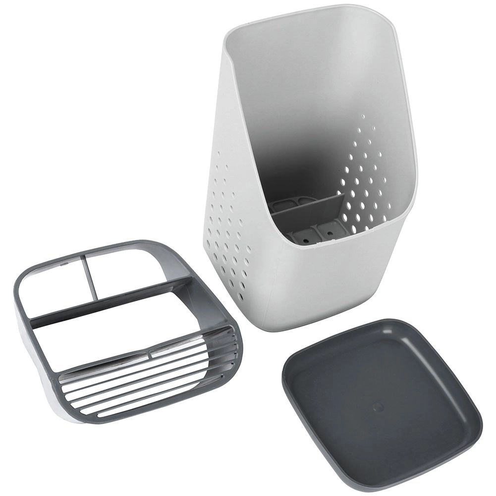 Odstranljiva odkapna osnova zbira vodo, zato pripomočki ne stojijo v vodi in okolica ostane suha. Perforirane stranice spodbujajo kroženje zraka in hitro sušenje. Lahka, a čvrsta in enostavno pralna zasnova je idealna kot odkapljalnik po pranju ali kot stalno stojalo na delovni površini.
