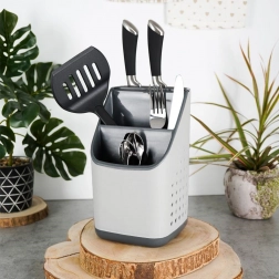 Ta kompaktni organizator z merami 14 × 14 × 23 cm ponuja premišljeno shranjevanje vsakodnevnih kuhinjskih pomočnikov. Tri prostorni predelki sprejmejo žlice, vilice, lopatke ali metlice, medtem ko zgornji del s 7 režami za nože zagotavlja varno in pregledno shranjevanje rezil.