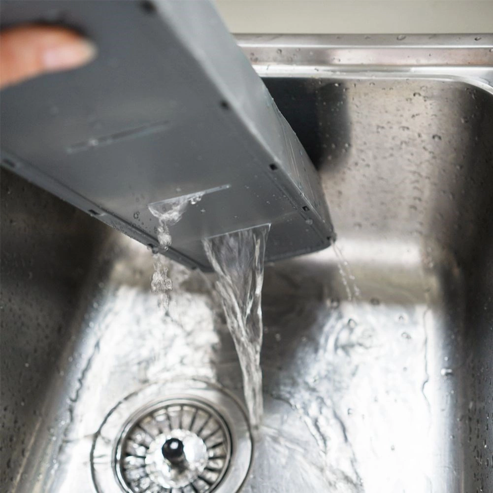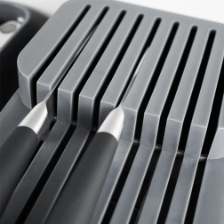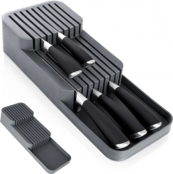 Organizator sprejme do 18 nožev različnih dolžin – od majhnih nožkov do daljših kuharskih nožev. Vsak nož ima svoj vodilni kanal, ki ščiti rezila pred topenjem in omogoča varno izvzemanje. Material je enostaven za vzdrževanje – dovolj je, da ga obrišete ali splaknete.