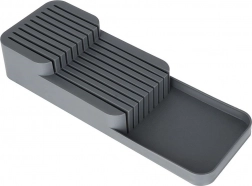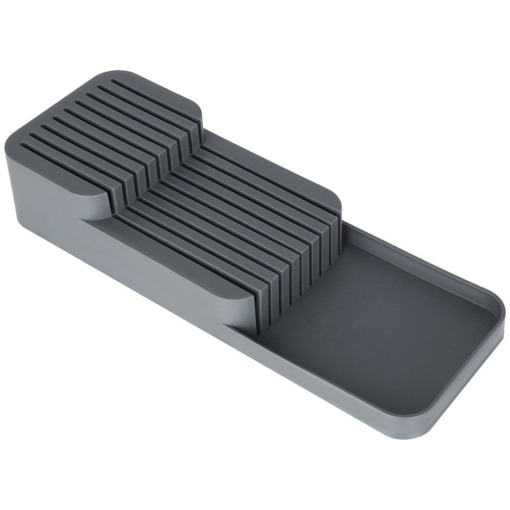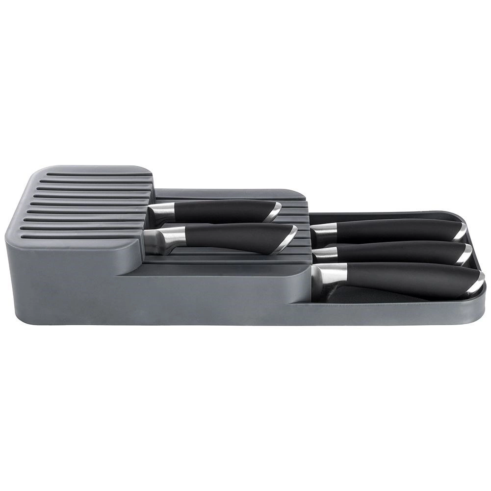 Ta praktični organizator za nože iz vzdržljive plastike ohranja vaše kuhinjsko orodje pregledno in na varnem. Zaradi premišljene zasnove se noži shranjujejo na dveh nivojih, zato zasedejo minimalno prostora, hkrati pa ostanejo lahko dostopni. Siva barva in čist dizajn se odlično podata vsaki sodobni kuhinji.