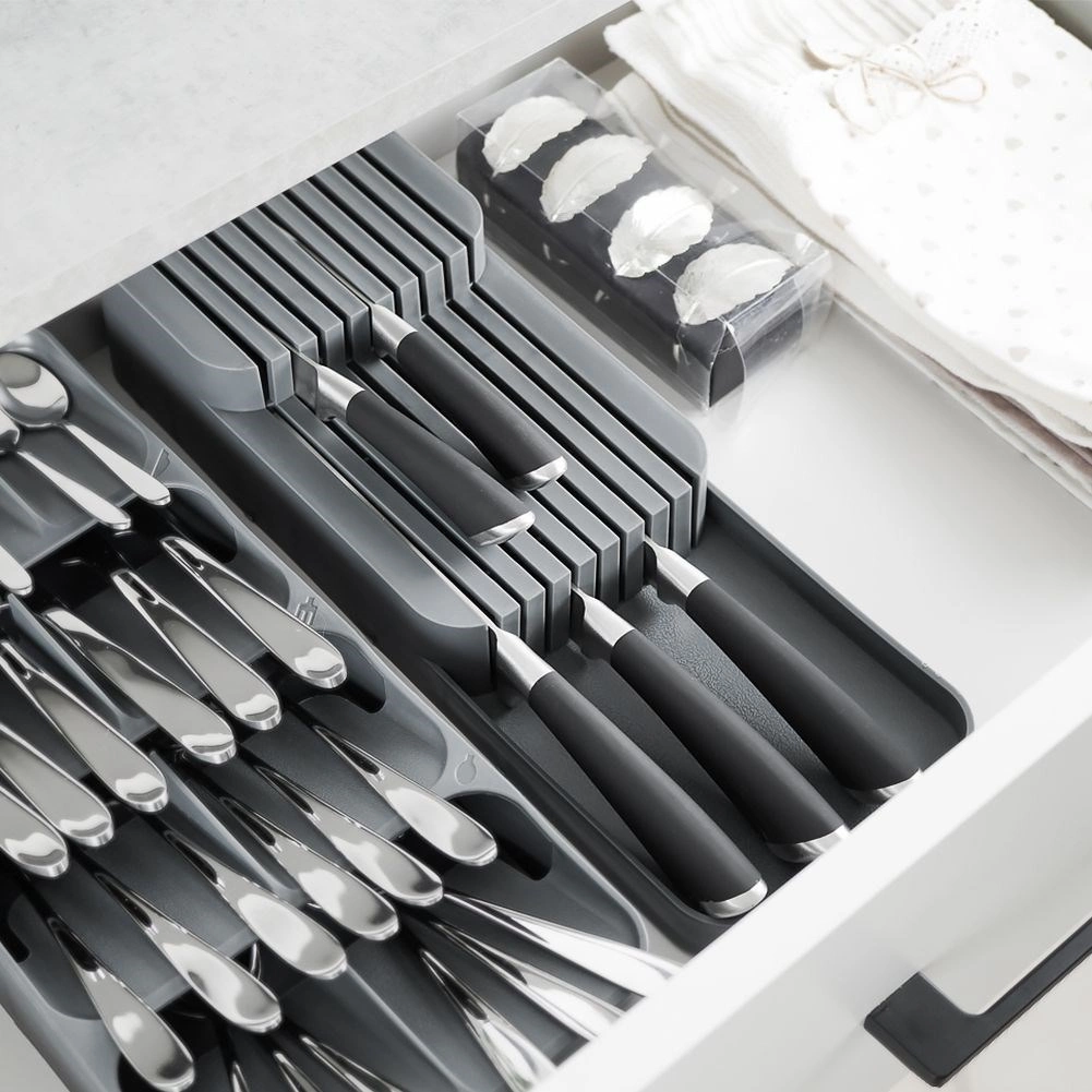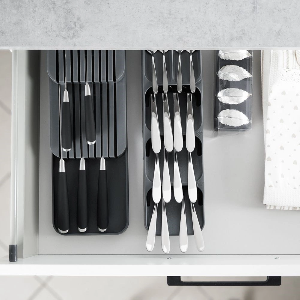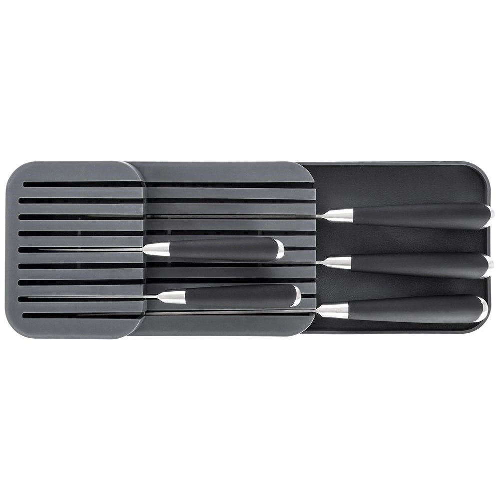 Stopničasta, večnivojska konstrukcija omogoča shranjevanje več nožev na manjšem prostoru in ohranja red v predalu.
