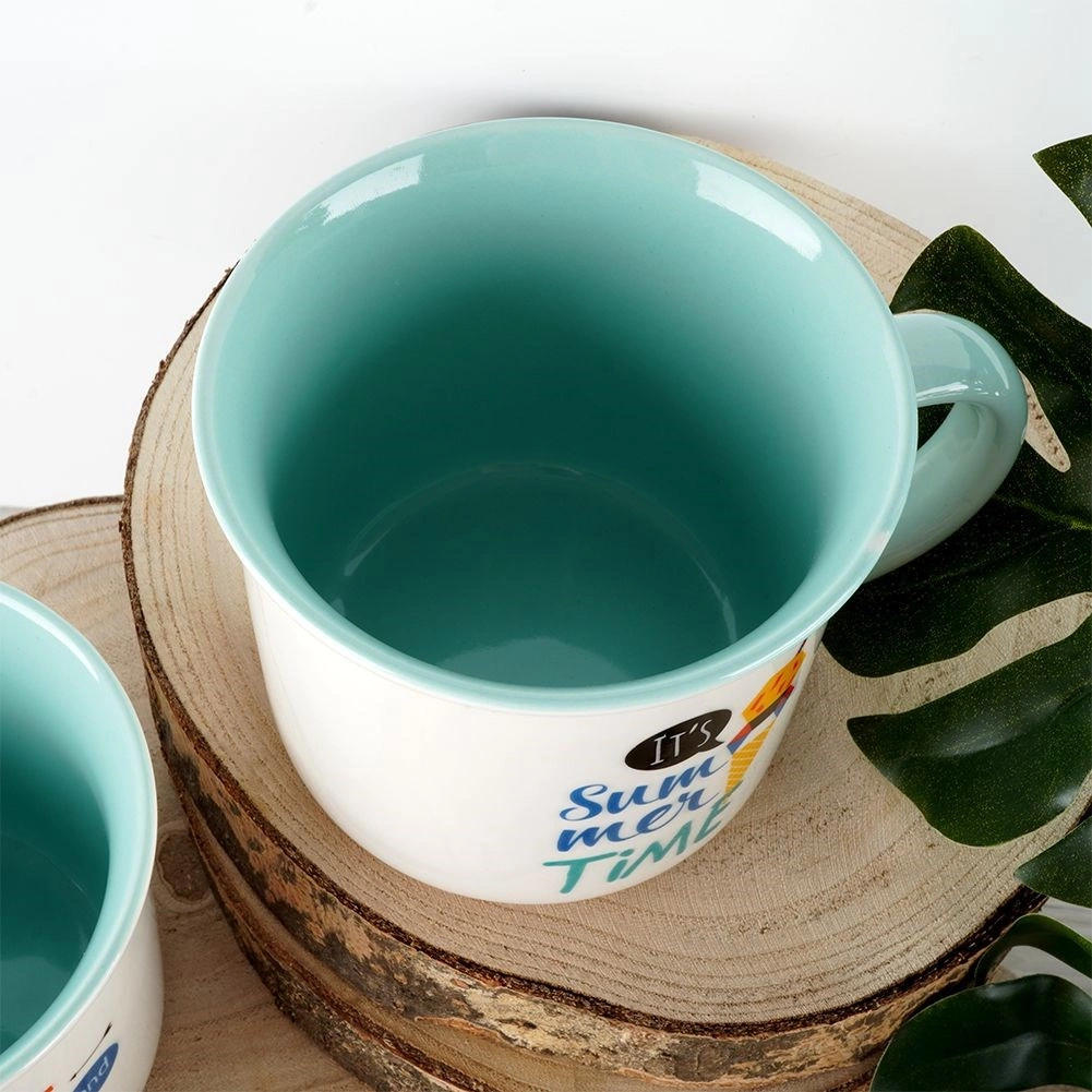 Uživajte v priljubljenem napitku v elegantni skodelici iz kakovostnega porcelana. Kombinacija bele barve s poletnim motivom in mint notranjostjo doda pogrinjku svež pridih. Skodelica se zaradi ergonomskega ročaja udobno drži in je odlična za vsakodnevno uporabo.