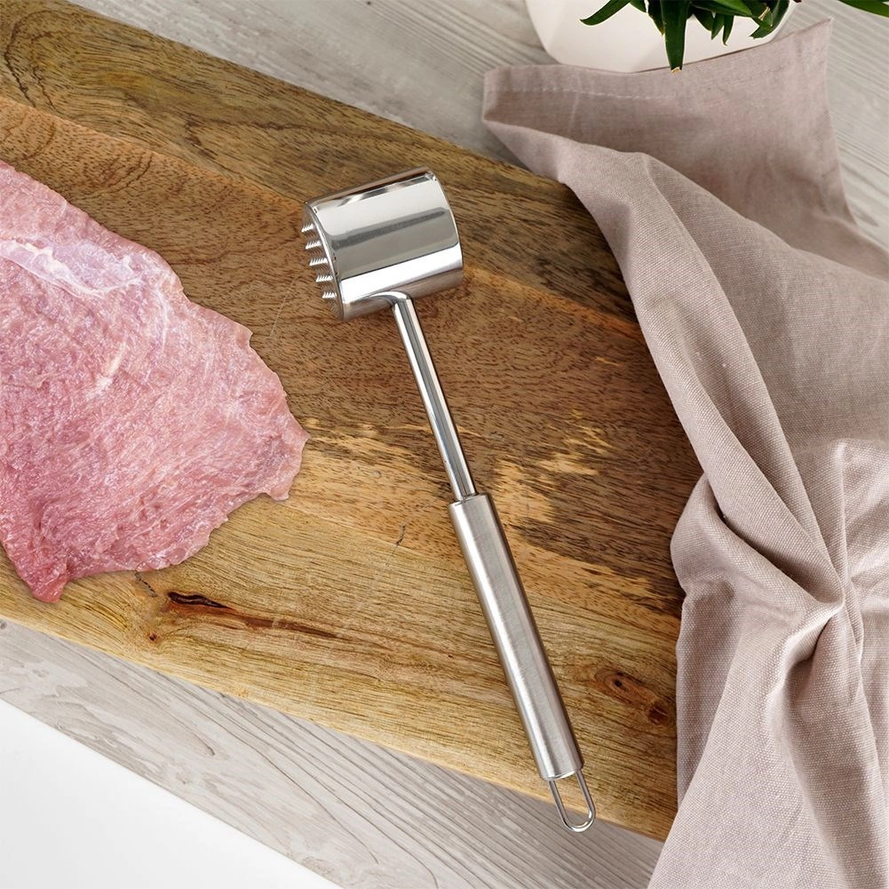 Visoko odporno nerjavno jeklo zagotavlja dolgo življenjsko dobo, higieno in enostavno čiščenje v pomivalnem stroju. Tenderizer je primeren za govedino, svinjino, perutnino in ribe, uporaben pa je tudi za drobljenje oreščkov ali ledu. Zanka na koncu ročaja omogoča praktično obešanje in shranjevanje.