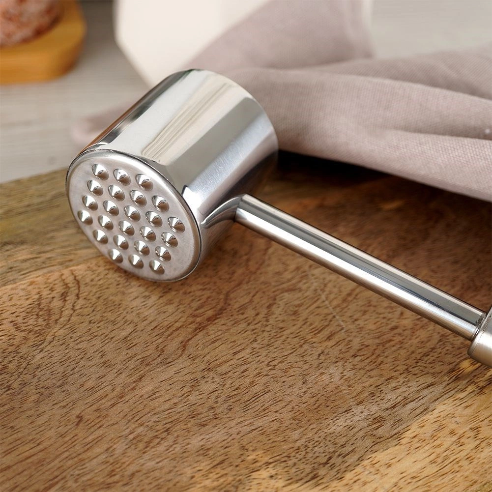 Robusten kuhinjski tolkač za meso iz nerjavnega jekla je idealen za pripravo steakov, kotlet in zrezkov. Gladka stran učinkovito splošči rezine, medtem ko stran z izboklinami meso zmehča in razbije vlakna za bolj sočen rezultat. Zaradi uravnotežene teže in udobnega ročaja odlično leži v roki, delo pa je hitro in natančno.