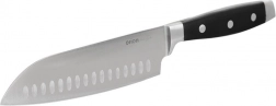 Santoku nož iz kolekcije Master je zanesljiv pomočnik v vsaki kuhinji – od domačega kuhanja do gastronomije. Zahvaljujoč kakovostnemu nerjavnemu jeklu in granton utorom se živila manj lepijo na rezilo, rezanje mesa, zelenjave ali rib pa je tekoče in natančno. Ergonomsko oblikovan ročaj iz ABS s 3 zakovicami odlično leži v roki in ne drsi.