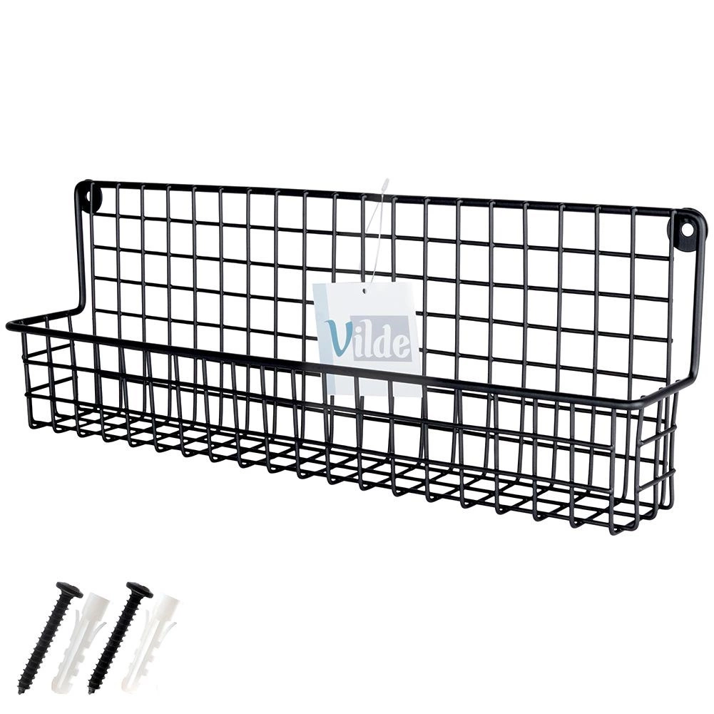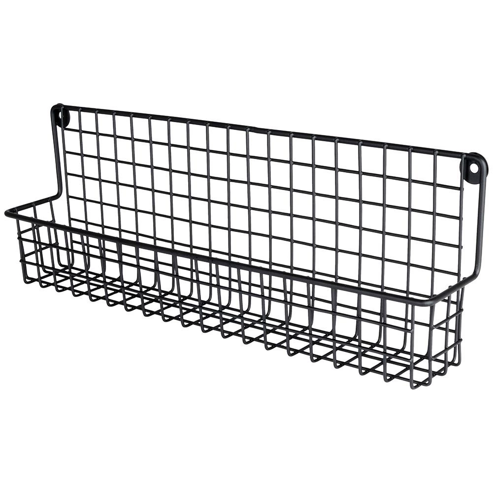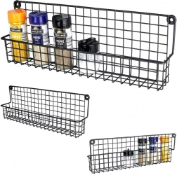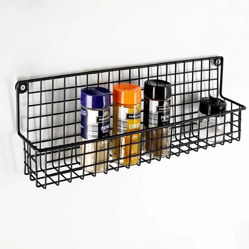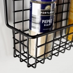 Odporna črna kovina z žično košaro varno drži začimbnice in majhne stekleničke na mestu ter omogoča pregledno shranjevanje.