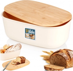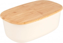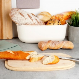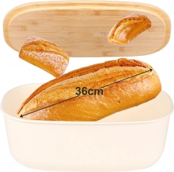 Stilska posoda za kruh v kremni barvi združuje sodoben dizajn in naravni bambus. Ohišje je izdelano iz trpežne plastike brez BPA, pokrov iz bambusovega lesa služi kot praktična rezalna deska. Zahvaljujoč velikodušnim meram 39 × 23,5 × 15,5 cm boste zlahka shranili kruh, bagete in žemljice.