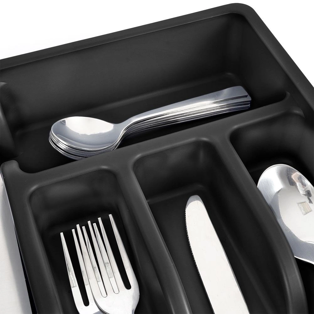 Uredite svojo kuhinjo enkrat za vselej. Ta prostoren organizator za jedilni pribor ponuja pet premišljeno zasnovanih predelkov: tri za običajen pribor, enega za čajne žličke in dolg predel za kuhinjske pripomočke ali daljše nože. Razporeditev pomaga ohranjati red, pospeši delo v kuhinji in kar najbolje izkoristi prostor v predalu.