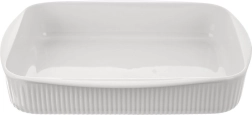 Praktična bela porcelanasta pekač posoda z volumnom 2,2 l in merami 30,5 × 24,5 × 5,5 cm za vsakodnevno peko in serviranje. Izdelana iz kakovostnega porcelana iz tradicionalne porcelanarne v Karlovarski regiji, primerna za pečico, mikrovalovno pečico, hladilnik in pomivalni stroj. Rebrana zunanja površina, gladko notranje glaziranje za lažje izstavljanje in čiščenje ter integrirani stranski ročaji za udobno prenašanje.