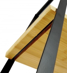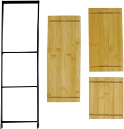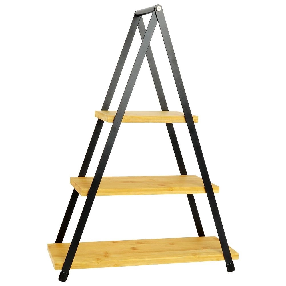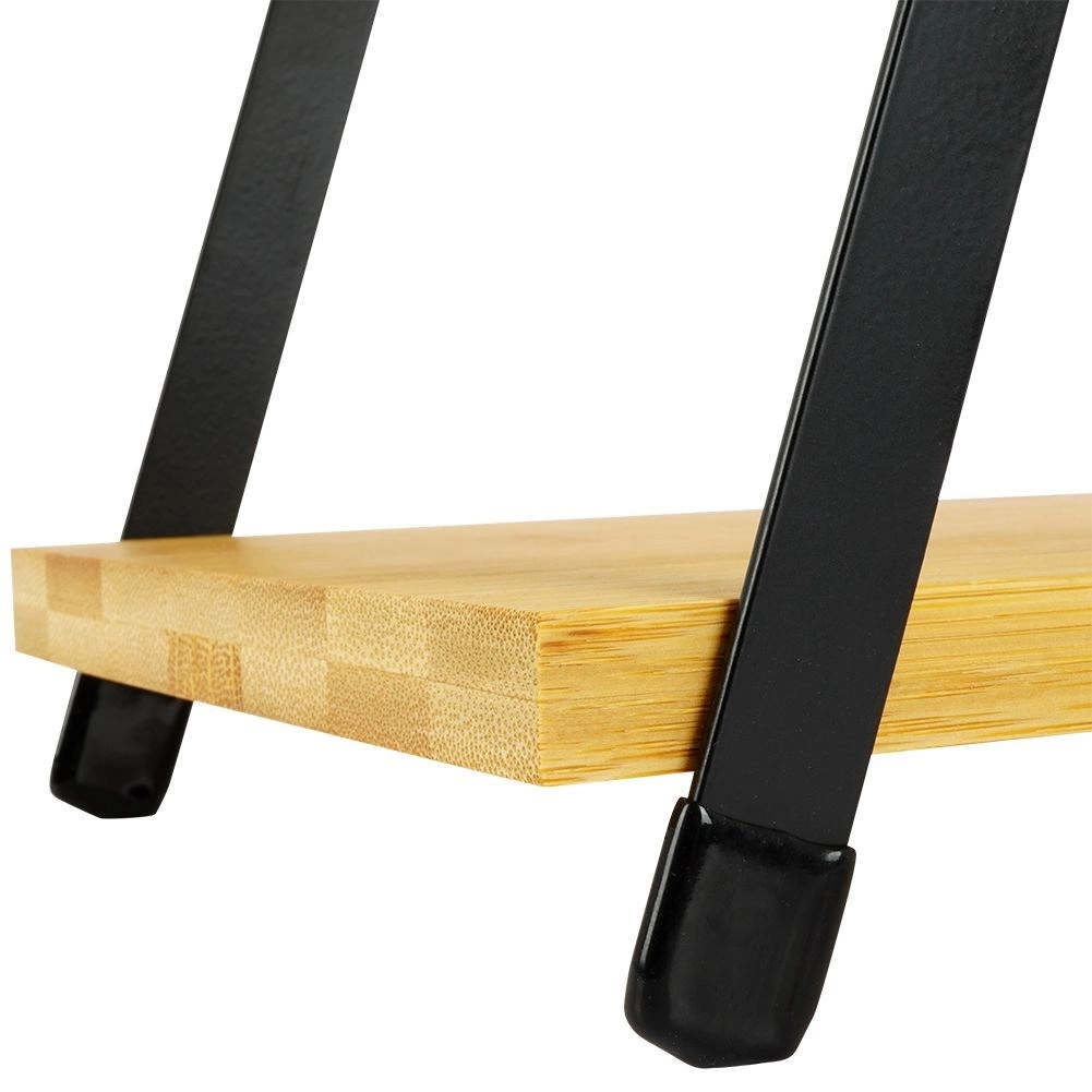 Ta stilska večnivojska patera združuje naravni bambus z robustno črno kovino za stabilno in dekorativno predstavitev prigrizkov. Odlična je za cupcake, pite, mini sladice, pa tudi za narezke s sirom in mesninami ter slane prigrizke. Trikotna A‑konstrukcija prihrani prostor na mizi in poudari vsako pogrnjeno mizo.