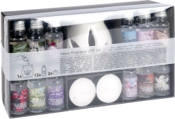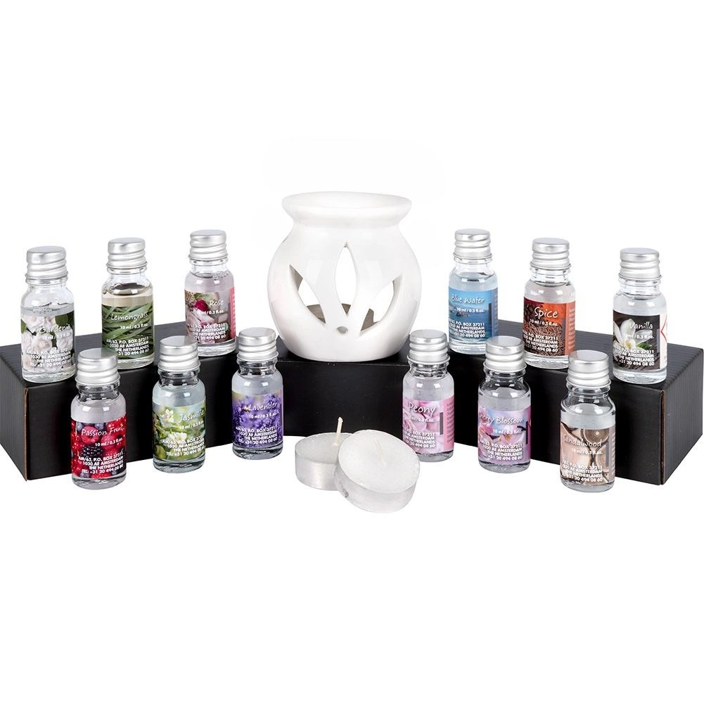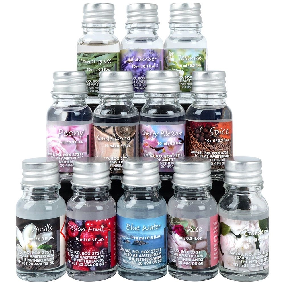 - 12× dišavno olje 10 ml: Spice, Passion Fruit, Peony, Sandalwood, Jasmine, Gardenia, Rose, Lemongrass, Lavender, Blue Water, Vanilla, Cherry Blossom