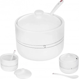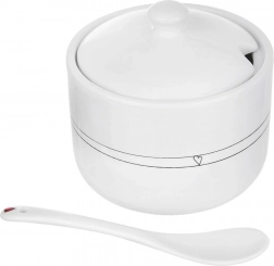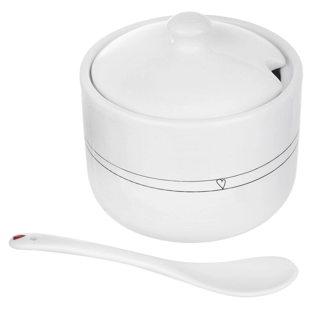 Ta stilska sladkornica v klasični beli barvi združuje praktičnost in dekorativni videz. Zahvaljujoč pokrovčku z izrezom ostane vsebina zaščitena, žlička pa vedno pri roki. Nežen motiv linije s srčkom in droben rdeč poudarek na žlički dodajata izviren šarm.