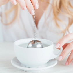 Cedilo ima kompaktno kroglasto obliko in varno zapiranje na klik, ki preprečuje neželeno odpiranje. Veriga s kavljem olajša rokovanje in obešanje na skodelico, kozarec ali čajnik. Uporabno je tudi pri kuhanju – za zelišča in začimbe v juhah ali osnovah.