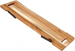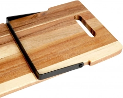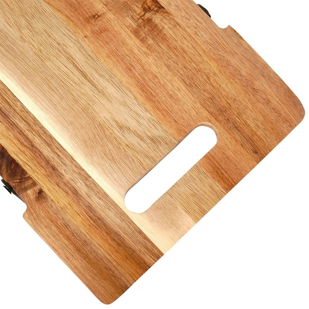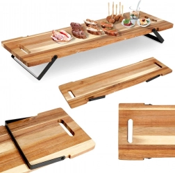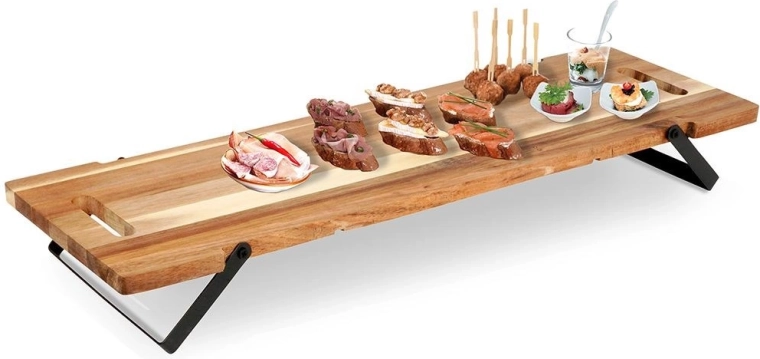 Ta dolg servirni pladenj iz akacije na zložljivih kovinskih nogah dvigne predstavitev vaših jedi na višjo raven. Integrirani ročaji ob straneh zagotavljajo udobno in varno prenašanje, medtem ko dvignjen položaj olajša zajemanje in ohranja mizo pregledno.