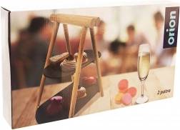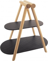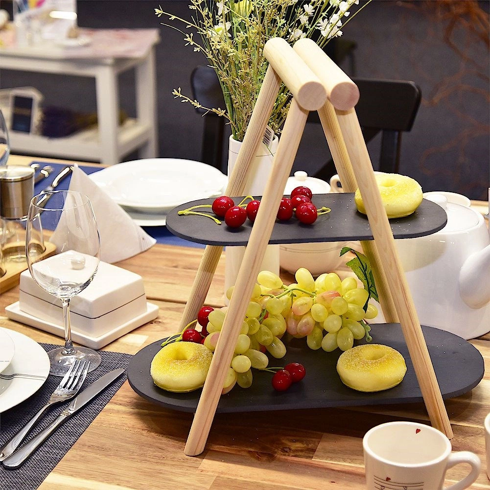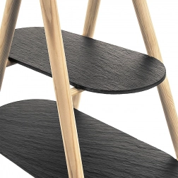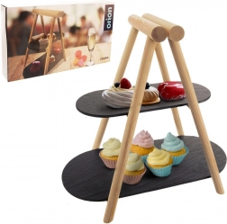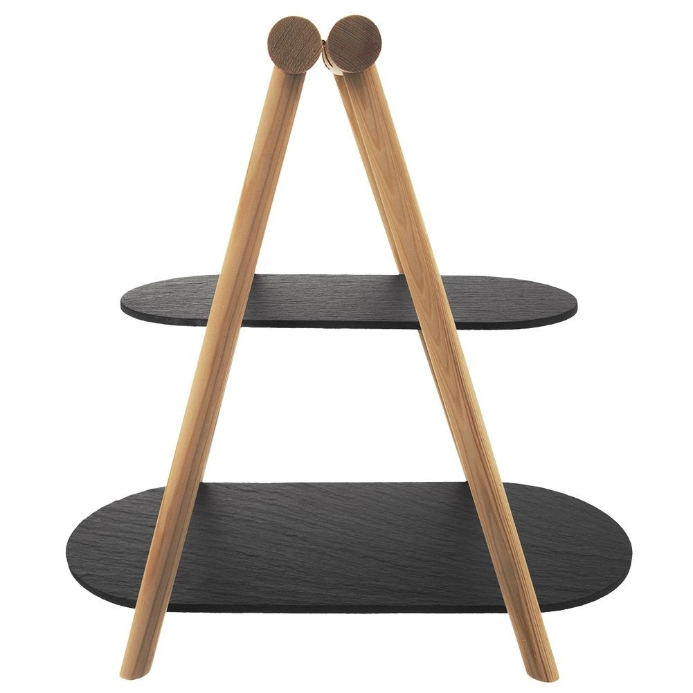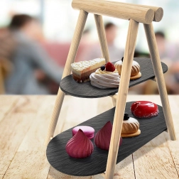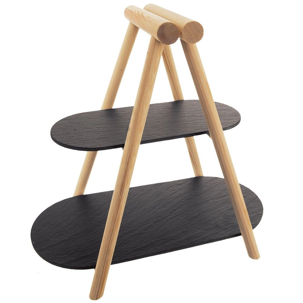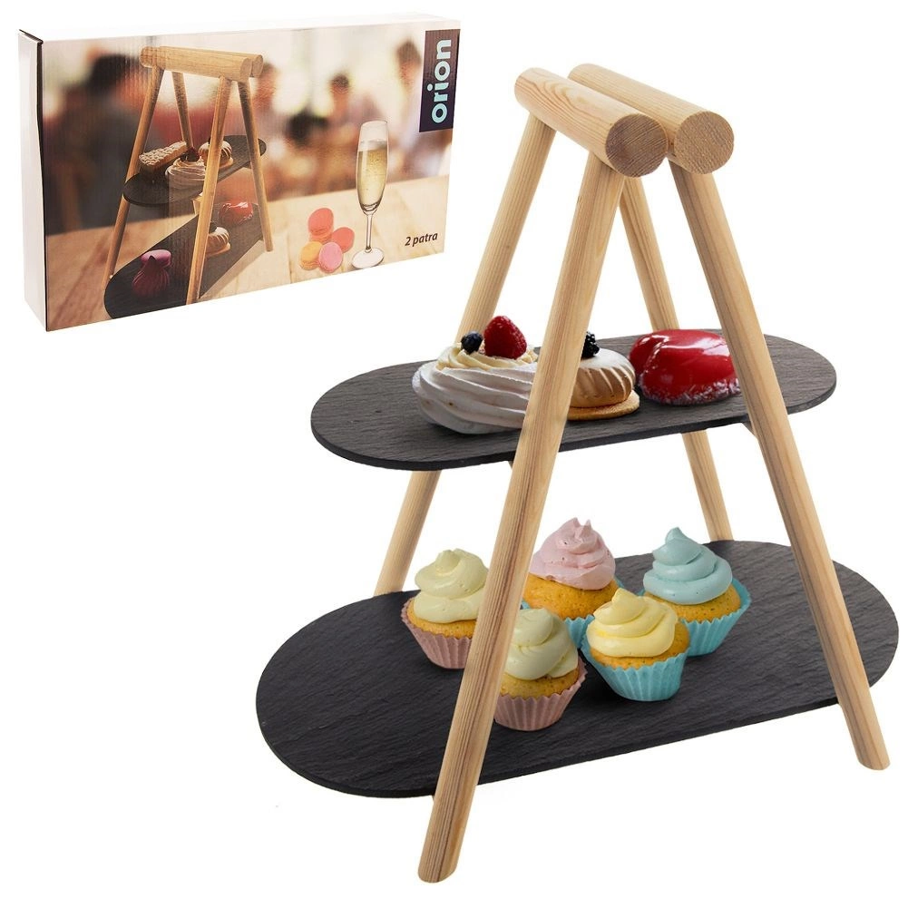 Ta dizajnerski dvonadstropni etažer izstopa na vsaki mizi. Povezava svetlega lesa in temnih skrilavčnih pladnjev deluje moderno in hkrati brezčasno. Zaradi dveh ravni prihrani prostor ter omogoča učinkovito predstavitev tortic, sadja, sirov, mesnin in kanapejev.