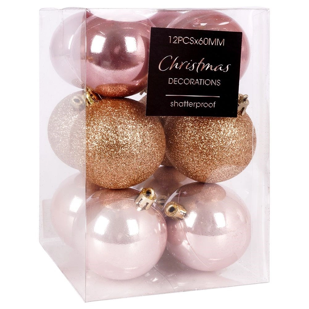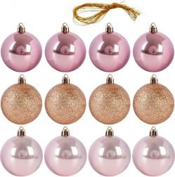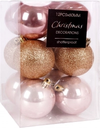 Set vsebuje 12 kroglic s premerom 6 cm v treh vrstah površin za raznolik vizualni učinek: 4× sijaj, 4× bleščanje, 4× mat. Kroglice imajo kovinske pokrovčke z ušescem, v pakiranju pa najdete tudi vrvice za enostavno obešanje. Vse je lično zapakirano v prozorni škatli – idealno tudi kot božično darilo.