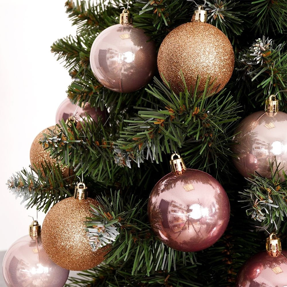Sijaj, bleščanje in mat v rožnatih in rose gold odtenkih ustvarijo harmoničen in eleganten videz božičnega drevesa.