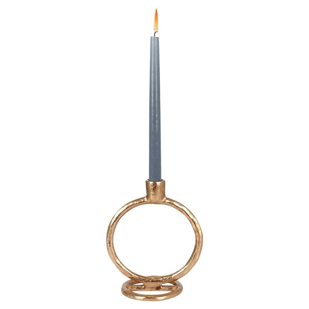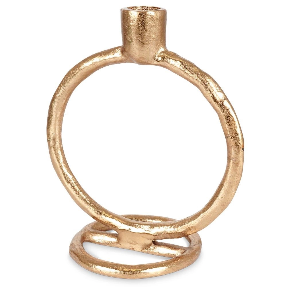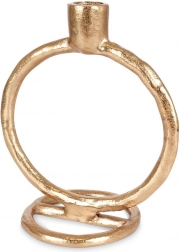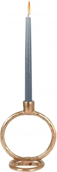 Eleganten svečnik za eno dolgo svečo je izdelan iz kakovostnega aluminija v zlati barvi. Zaradi čvrste izdelave in okrogle stabilne osnove svečo varno drži in hkrati postane izrazit oblikovalski element vašega doma.