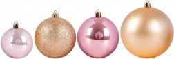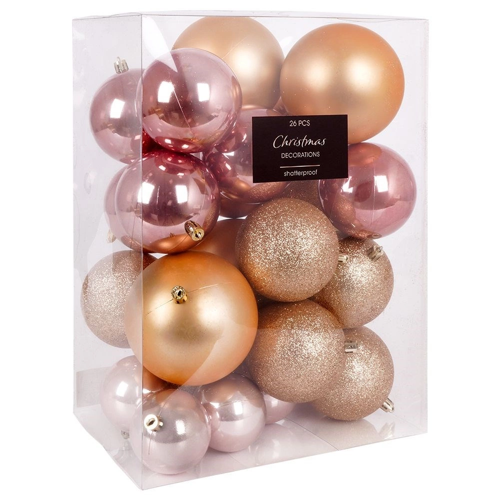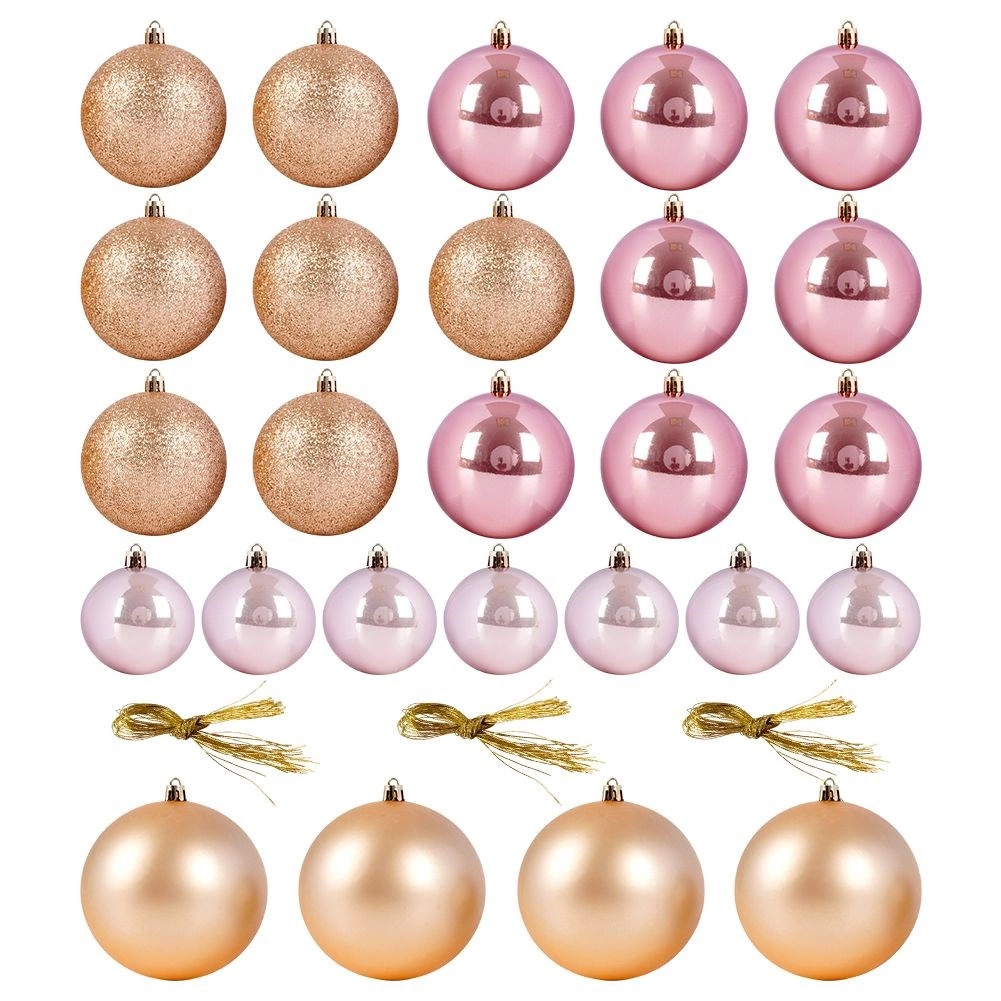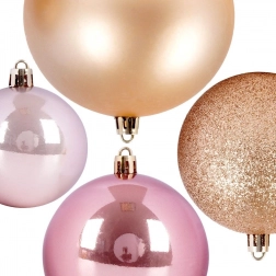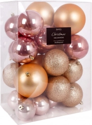 S tem vsestranskim kompletom v odtenkih rožnate in rožnatega zlata zlahka ustvarite stilsko božično dekoracijo. Različne velikosti 6, 8 in 10 cm ter mešanica površinskih obdelav (mat, sijaj, bleščice) dodajo drevescu globino in iskrico. Kroglice so lahke, trpežne in jih zaradi kovinskih očesc preprosto obesite.