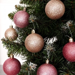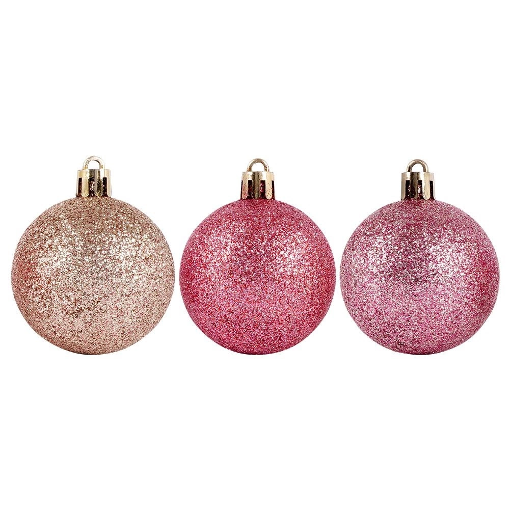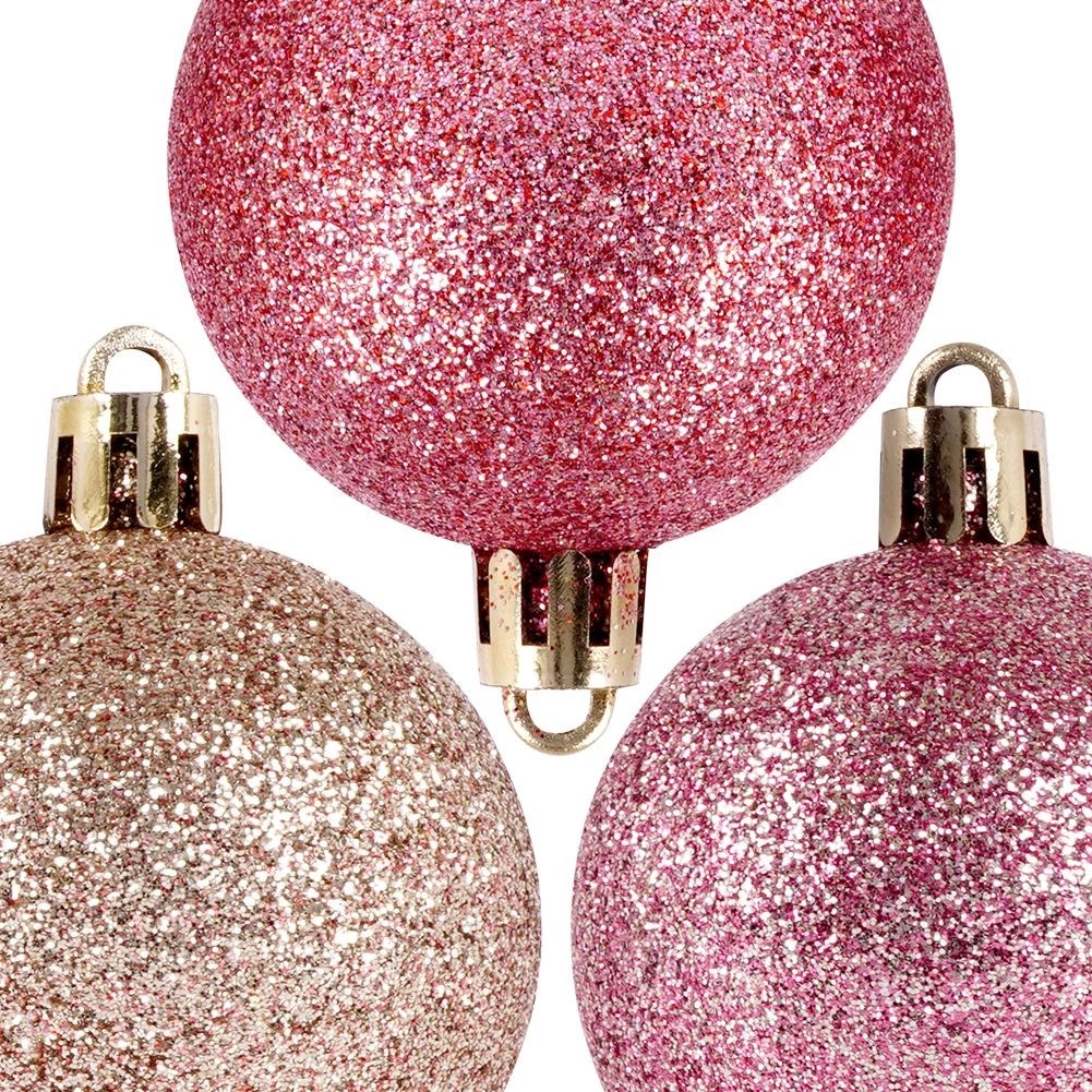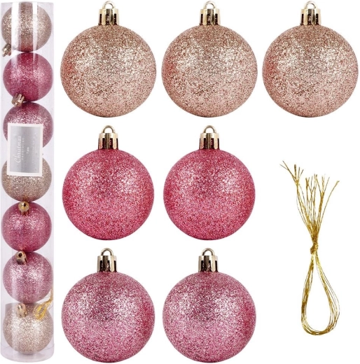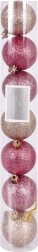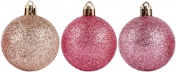 Komplet združuje tri rožnate tone z bleščečo (glitter) površino za razkošen, sijoč videz, ki poudari vsako božično okrasitev.