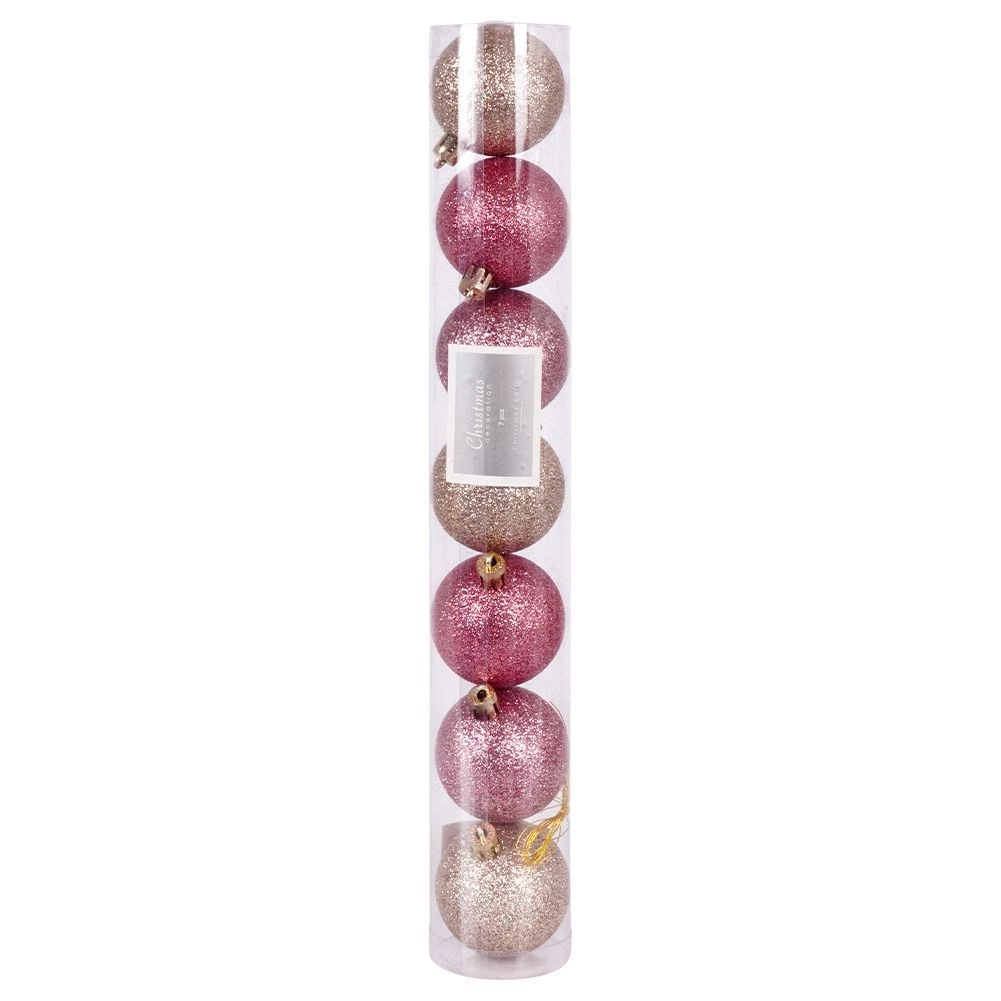 Ustvarite čarobno praznično vzdušje s kompletom 7 rožnatih božičnih okraskov v nežnih odtenkih rožnate z bleščečo površino. Vsaka krogla ima premer 5 cm in je opremljena s kovinskim pokrovčkom za preprosto obešanje. Okraski so iz kakovostne plastike, ki vizualno spominja na steklo, a je bistveno trpežnejša in varnejša.
