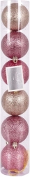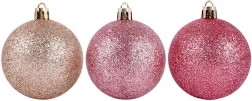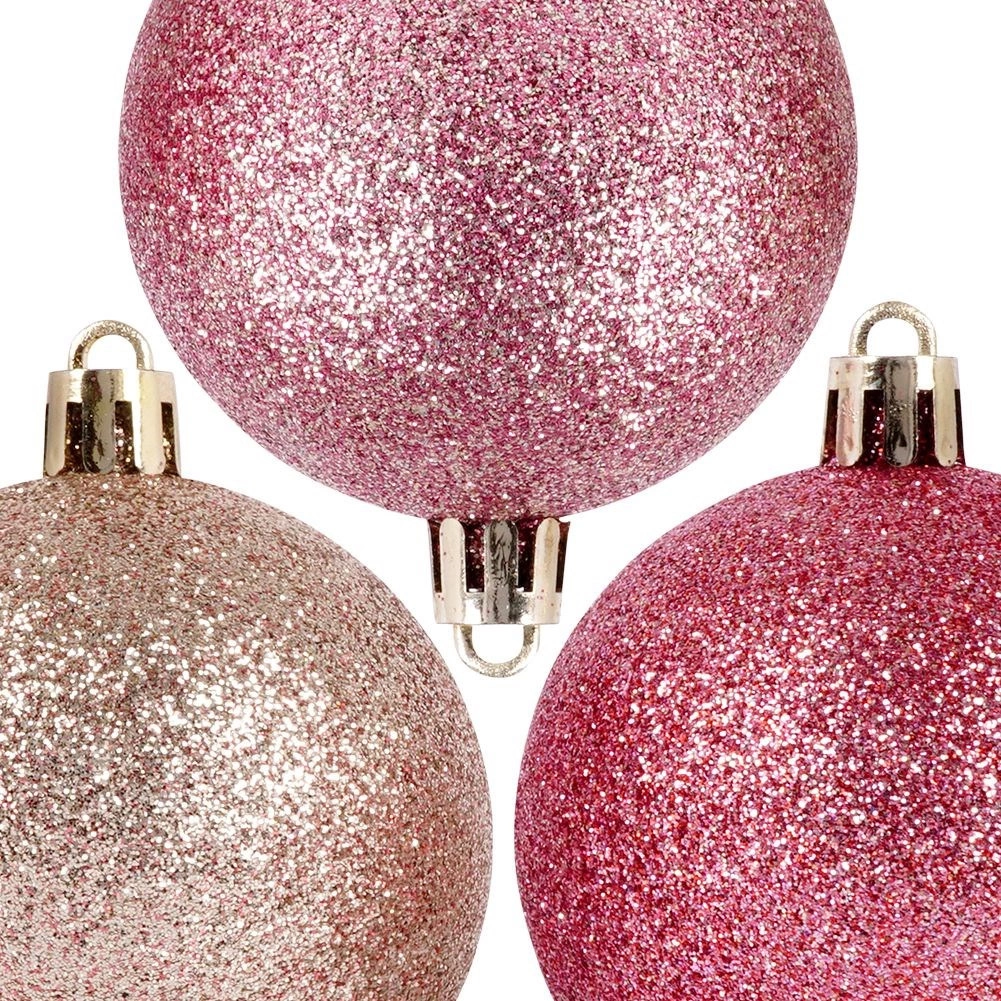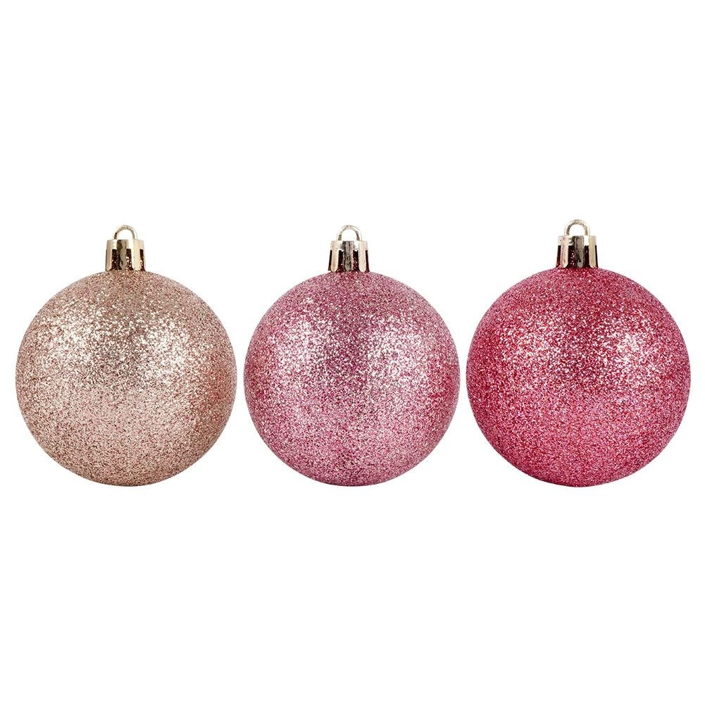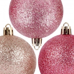 Komplet združuje tri rožnate tone v bleščicasti izvedbi, ki božičnemu drevescu dodajo globino in eleganten čar.