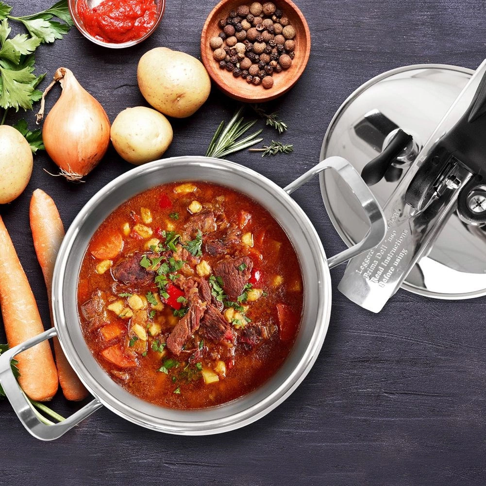 Uživajte v hitri pripravi juh, mesa in stročnic na vseh vrstah kuhalnih plošč, vključno z indukcijo. Troslojno akutermično dno enakomerno razporeja toploto, z možnostjo uravnavanja pritiska pa dosežete popolne rezultate pri vsakem kuhanju.
