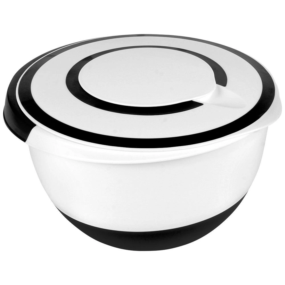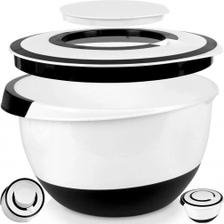 Ta prostorna skleda s prostornino 5 litrov je idealen pomočnik za pripravo test, krem in stepene smetane. Dvodelni pokrov omogoča udobno uporabo ročnega mešalnika brez nereda – odstranite le sredinski del in vsebina ostane varno v notranjosti. Zahvaljujoč protizdrsnemu dnu je skleda pri delu stabilna, izlivni gobček pa zagotavlja čisto in natančno prelivanje.